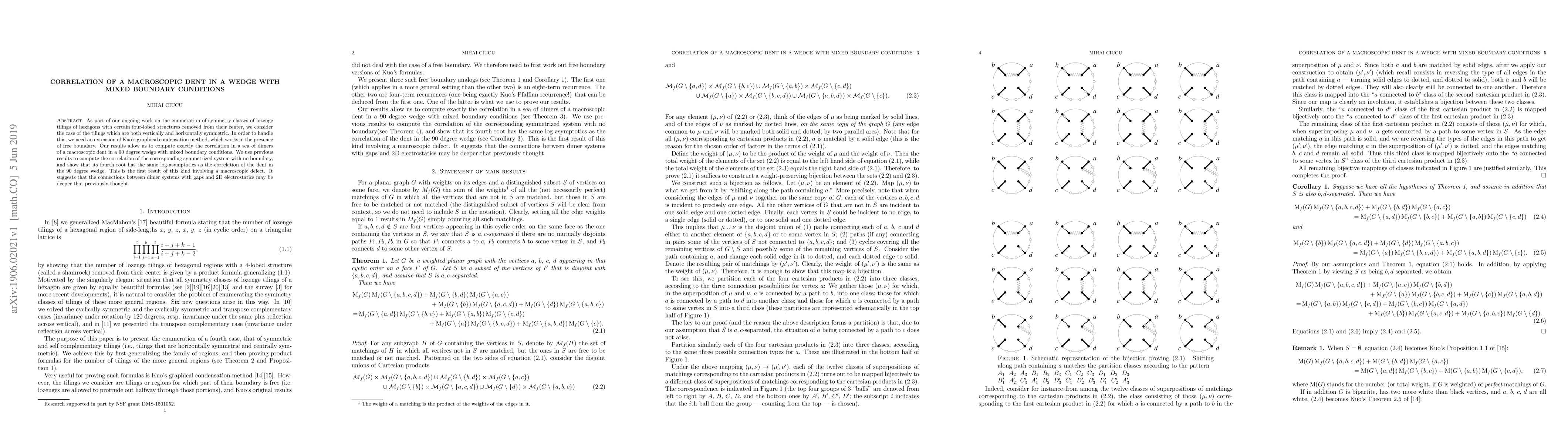 As part of our ongoing work on the enumeration of symmetry classes of lozenge tilings of hexagons with certain four-lobed structures removed from their center, we consider the case of the tilings which are both vertically and horizontally symmetric. In order to handle this, we need an extension of Kuo's graphical condensation method, which works in the presence of free boundary. Our results allow us to compute exactly the correlation in a sea of dimers of a macroscopic dent in a 90 degree wedge with mixed boundary conditions. We use previous results to compute the correlation of the corresponding symmetrized system with no boundary, and show that its fourth root has the same log-asymptotics as the correlation of the dent in the 90 degree wedge. This is the first result of this kind involving a macroscopic defect. It suggests that the connections between dimer systems with gaps and 2D electrostatics may be deeper that previously thought.