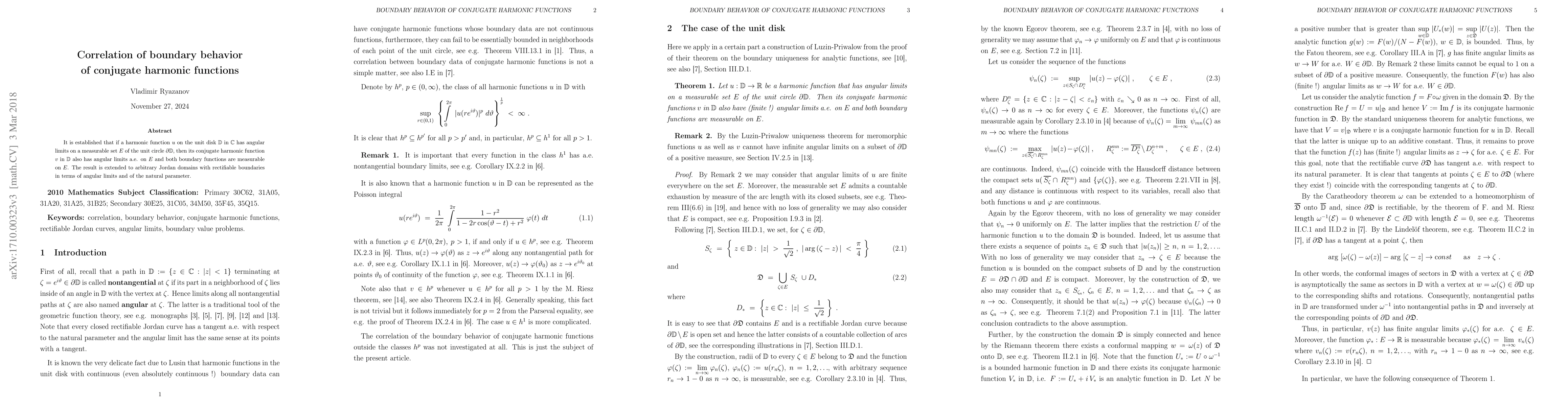Summary: The paper proves that if a harmonic function on the unit disk has angular limits on a measurable set of its boundary, then its conjugate harmonic function also has angular limits almost everywhere on that set, both being finite and measurable. This result is generalized to Jordan domains with rectifiable boundaries.