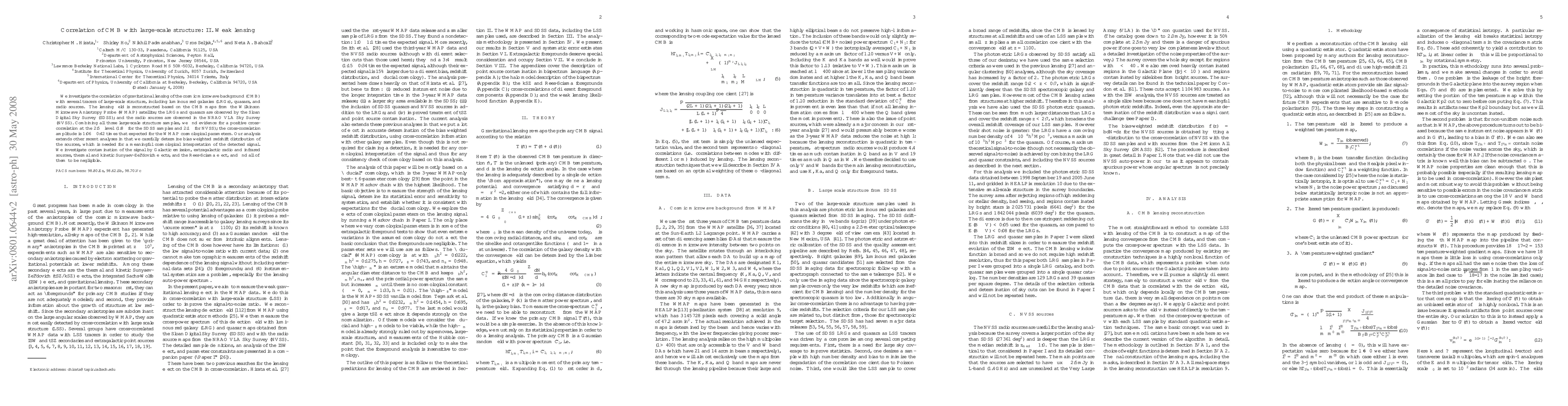 We investigate the correlation of gravitational lensing of the cosmic microwave background (CMB) with several tracers of large-scale structure, including luminous red galaxies (LRGs), quasars, and radio sources. The lensing field is reconstructed based on the CMB maps from the Wilkinson Microwave Anisotropy Probe (WMAP) satellite; the LRGs and quasars are observed by the Sloan Digital Sky Survey (SDSS); and the radio sources are observed in the NRAO VLA Sky Survey (NVSS). Combining all three large-scale structure samples, we find evidence for a positive cross-correlation at the $2.5\sigma$ level ($1.8\sigma$ for the SDSS samples and $2.1\sigma$ for NVSS); the cross-correlation amplitude is $1.06\pm 0.42$ times that expected for the WMAP cosmological parameters. Our analysis extends other recent analyses in that we carefully determine bias weighted redshift distribution of the sources, which is needed for a meaningful cosmological interpretation of the detected signal. We investigate contamination of the signal by Galactic emission, extragalactic radio and infrared sources, thermal and kinetic Sunyaev-Zel'dovich effects, and the Rees-Sciama effect, and find all of them to be negligible.