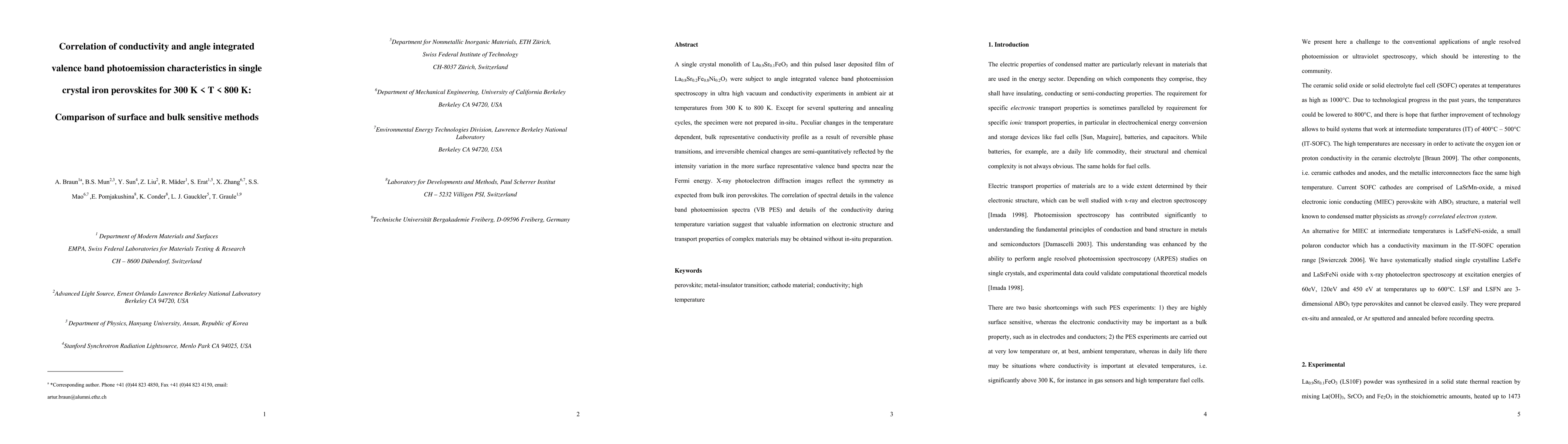A single crystal monolith of La0.9Sr0.1FeO3 and thin pulsed laser deposited film of La0.8Sr0.2Fe0.8Ni0.2O3 were subject to angle integrated valence band photoemission spectroscopy in ultra high vacuum and conductivity experiments in ambient air at temperatures from 300 K to 800 K. Except for several sputtering and annealing cycles, the specimen were not prepared in-situ.. Peculiar changes in the temperature dependent, bulk representative conductivity profile as a result of reversible phase transitions, and irreversible chemical changes are semi-quantitatively reflected by the intensity variation in the more surface representative valence band spectra near the Fermi energy. X-ray photoelectron diffraction images reflect the symmetry as expected from bulk iron perovskites. The correlation of spectral details in the valence band photoemission spectra (VB PES) and details of the conductivity during temperature variation suggest that valuable information on electronic structure and transport properties of complex materials may be obtained without in-situ preparation.