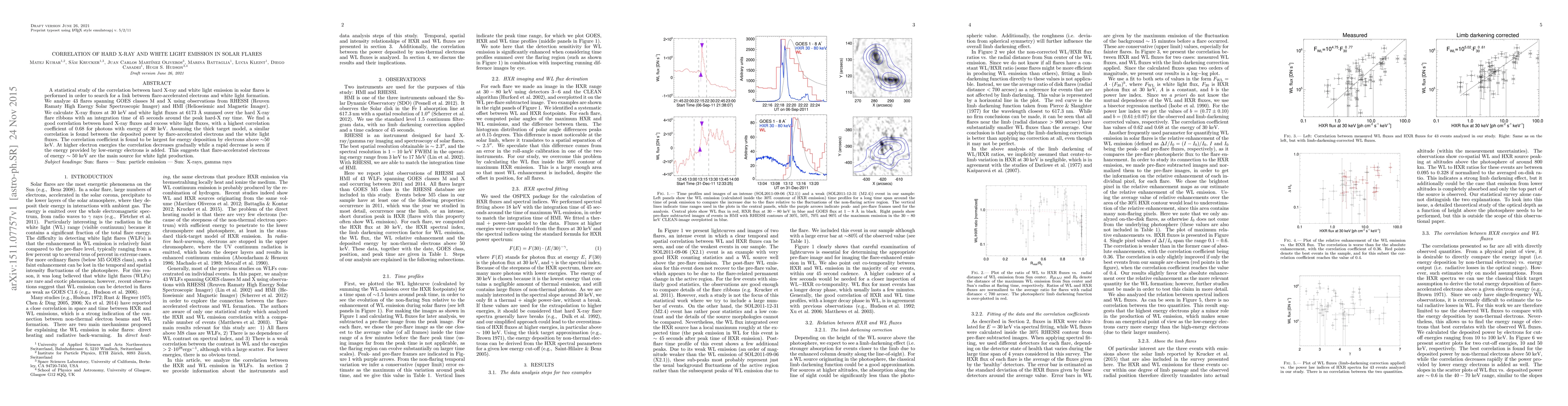 This study investigates the correlation between hard X-ray and white light emissions in solar flares, finding a strong link between electrons at ~50 keV and white light formation, with a peak correlation coefficient of 0.68 for 30 keV photons. The analysis supports the thick-target model, indicating that electrons with energies around 50 keV are primarily responsible for the observed white light.