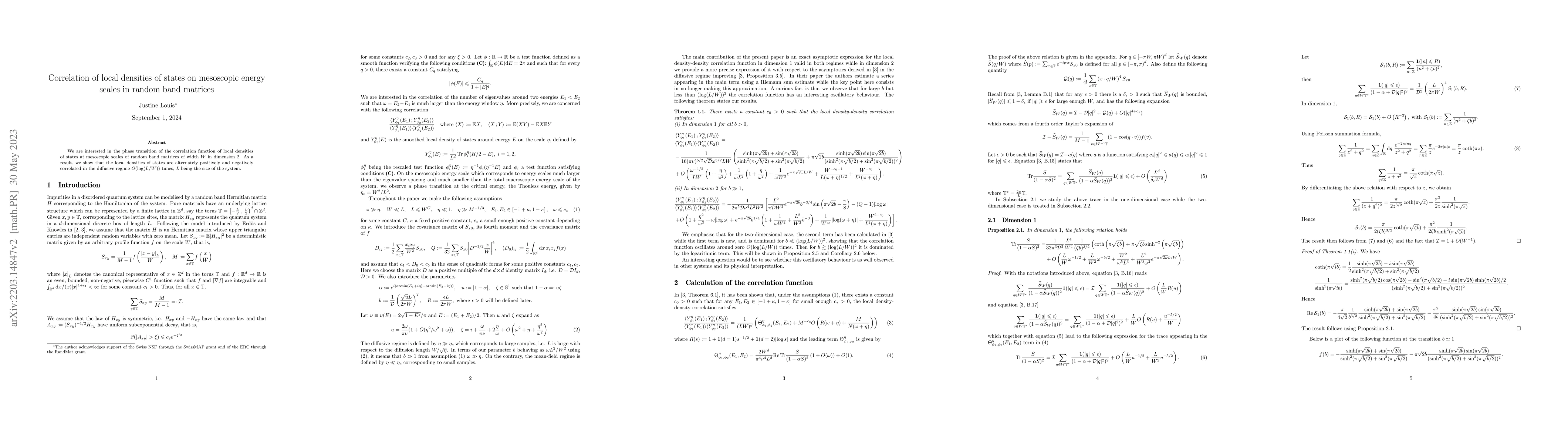 This paper investigates the phase transition in the correlation function of local densities of states in random band matrices, revealing alternating positive and negative correlations in the diffusive regime at mesoscopic scales, specifically $O(\log(L/W))$ times, where $L$ is the system size.