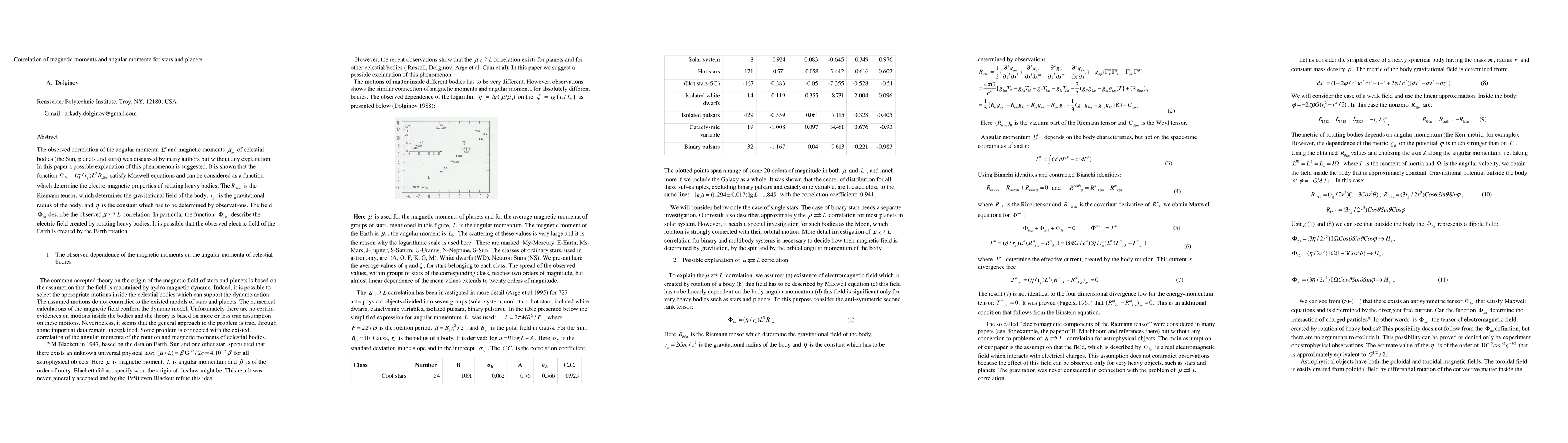 The observed correlation of the angular momenta $L^{ik}$ and magnetic moments $\mu_{lm}$ of celestial bodies (the Sun, planets and stars) was discussed by many authors but without any explanation. In this paper a possible explanation of this phenomenon is suggested. It is shown that the function $\Phi_{lm} =(\eta/r_g)L^{ik}R_{iklm}$ satisfy Maxwell equations and can be considered as a function which determine the electro-magnetic properties of rotating heavy bodies. The $R_{iklm}$ is the Riemann tensor, which determines the gravitational field of the body, $r_g$ is the gravitational radius of the body, and $\eta$ is the constant which has to be determined by observations. The field $\Phi_{lm}$ describe the observed $\mu \leftrightarrow L$ correlation. In particular the function $\Phi_{l0}$ describe the electric field created by rotating heavy bodies. It is possible that the observed electric field of the Earth is created by the Earth rotation