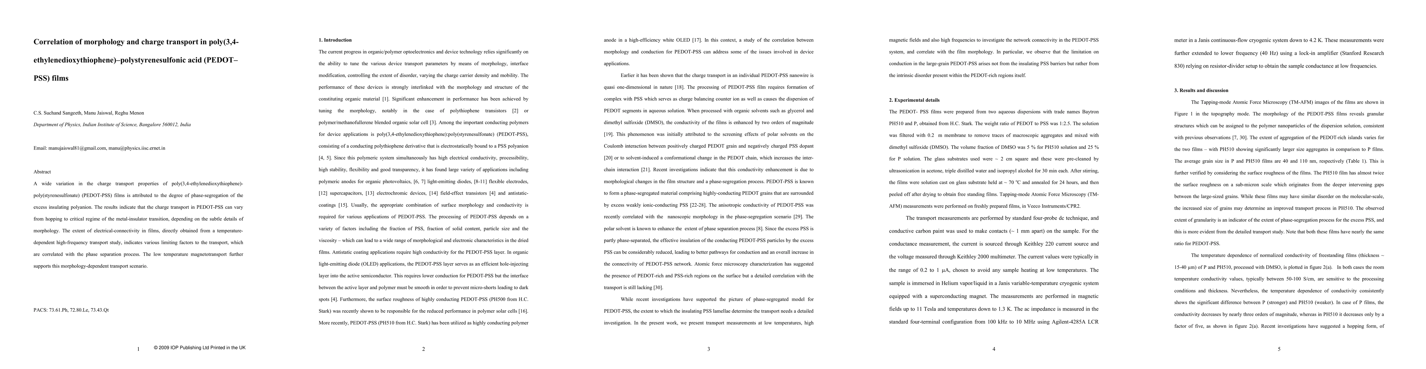 This study investigates the relationship between the morphology and charge transport in PEDOT-PSS films, revealing that phase-segregation of the insulating polyanion significantly influences transport properties, ranging from hopping to the metal-insulator transition. Temperature-dependent transport studies and low-temperature magnetotransport support the correlation between morphology and electrical connectivity.