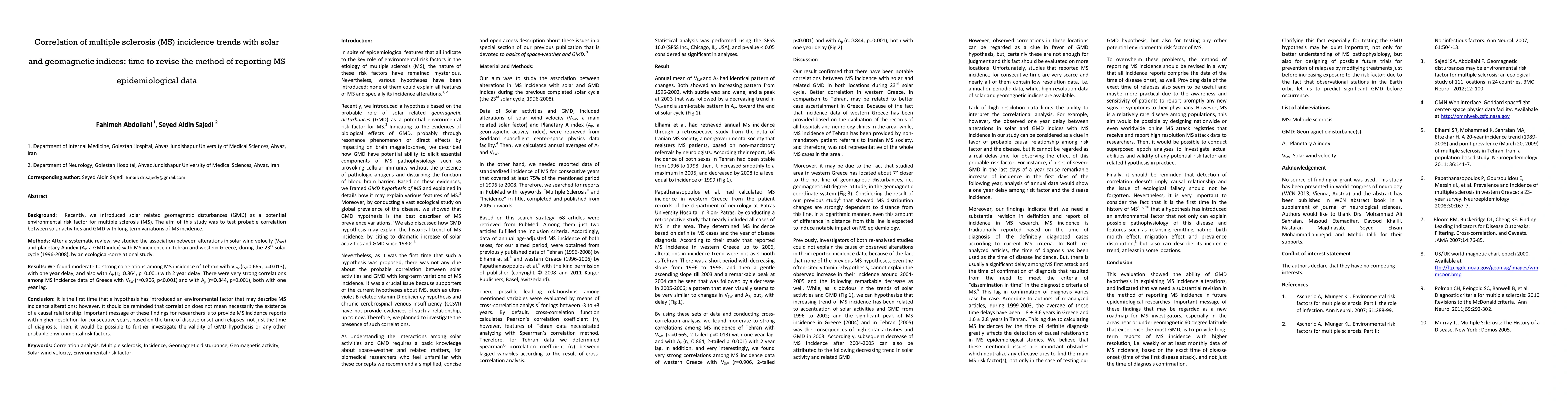 Background: Recently, we introduced solar related geomagnetic disturbances (GMD) as a potential environmental risk factor for multiple sclerosis (MS). The aim of this study was to test probable correlation between solar activities and GMD with long-term variations of MS incidence. Methods: After a systematic review, we studied the association between alterations in solar wind velocity (Vsw) and planetary A index (Ap, a GMD index) with MS incidence in Tehran and western Greece, during the 23rd solar cycle (1996-2008), by an ecological-correlational study. Results: We found moderate to strong correlations among MS incidence of Tehran with Vsw (Rs=0.665, p=0.013), with one year delay, and also with Ap (Rs=0.864, p=0.001) with 2 year delay. There were very strong correlations among MS incidence data of Greece with Vsw (R=0.906, p<0.001) and with Ap (R=0.844, p=0.001), both with one year lag. Conclusion: It is the first time that a hypothesis has introduced an environmental factor that may describe MS incidence alterations; however, it should be reminded that correlation does not mean necessarily the existence of a causal relationship. Important message of these findings for researchers is to provide MS incidence reports with higher resolution for consecutive years, based on the time of disease onset and relapses, not just the time of diagnosis. Then, it would be possible to further investigate the validity of GMD hypothesis or any other probable environmental risk factors. Keywords: Correlation analysis, Multiple sclerosis, Incidence, Geomagnetic disturbance, Geomagnetic activity, Solar wind velocity, Environmental risk factor.