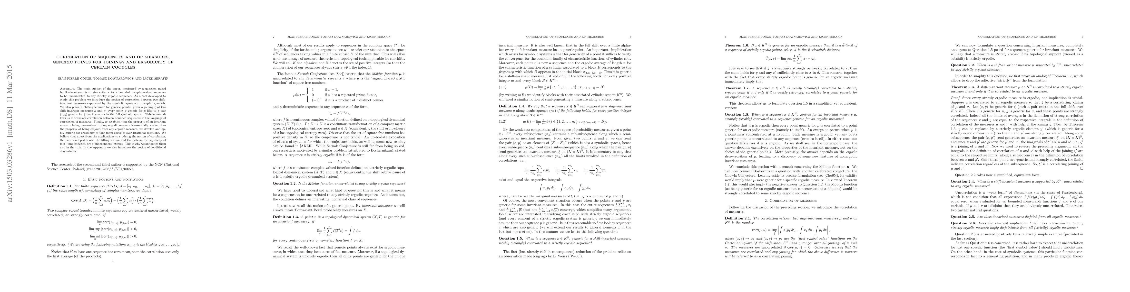 This paper develops criteria for a bounded complex-valued sequence to be uncorrelated to any strictly ergodic sequence, introducing the notion of correlation between shift-invariant measures and proving a "lifting lemma" for generic points. It also presents criteria for the ergodicity of four-jump cocycles over irrational rotations.