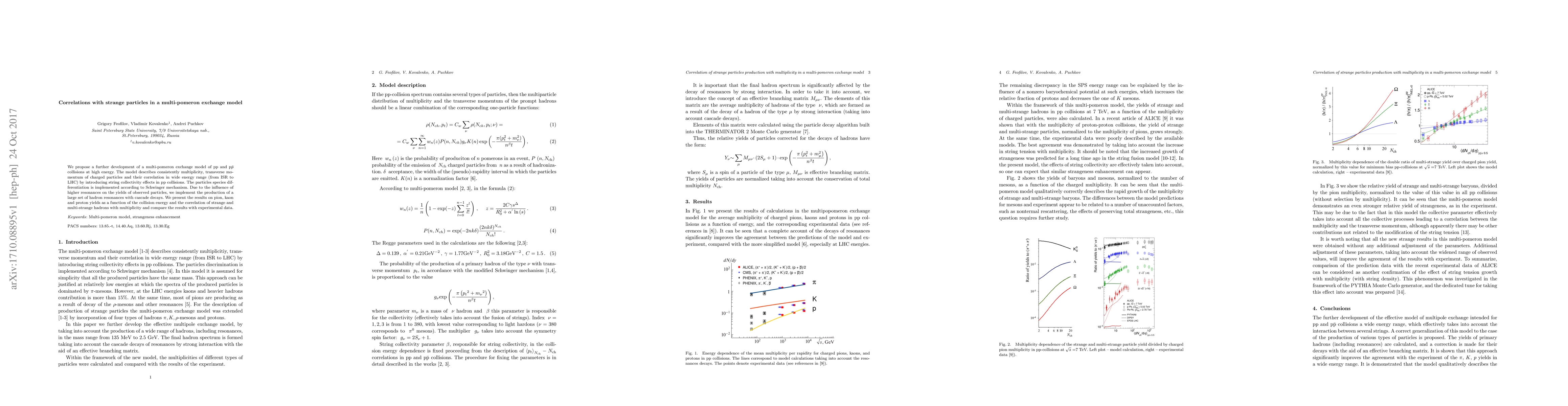 This paper develops a multi-pomeron exchange model to describe high-energy pp and p$\bar p$ collisions, incorporating string collectivity and resonance effects to predict particle yields and correlations. It compares model predictions for pion, kaon, and proton production with experimental data, focusing on the correlation between strange particle production and event multiplicity.