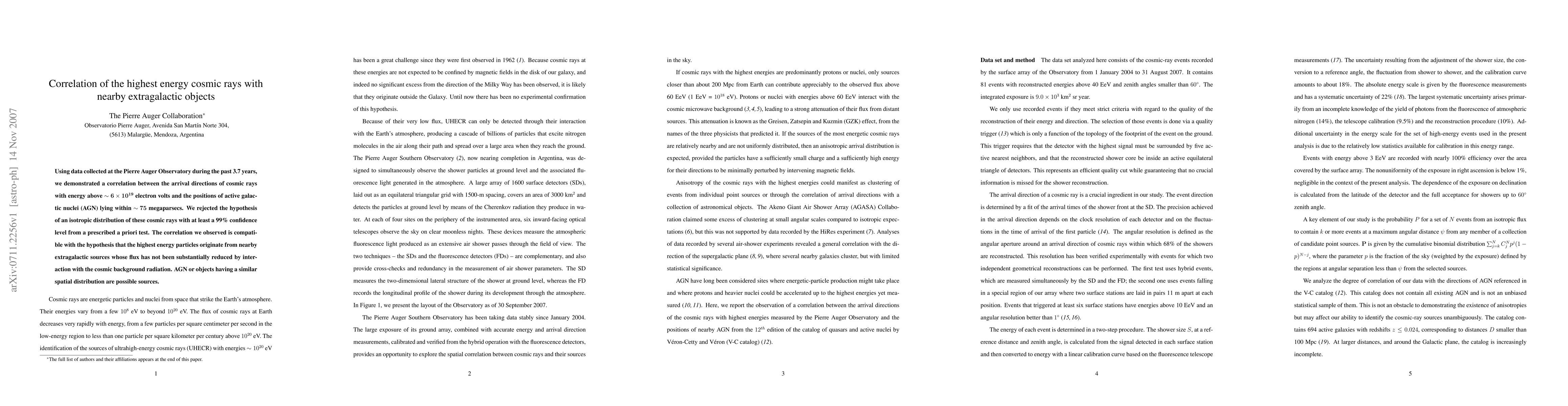 Summary: The Pierre Auger Observatory found a significant correlation between the directions of ultra-high energy cosmic rays and nearby active galactic nuclei, suggesting these cosmic rays likely originate from extragalactic sources within 75 megaparsecs. This correlation supports the hypothesis that these particles' flux is not significantly diminished by cosmic background interactions.