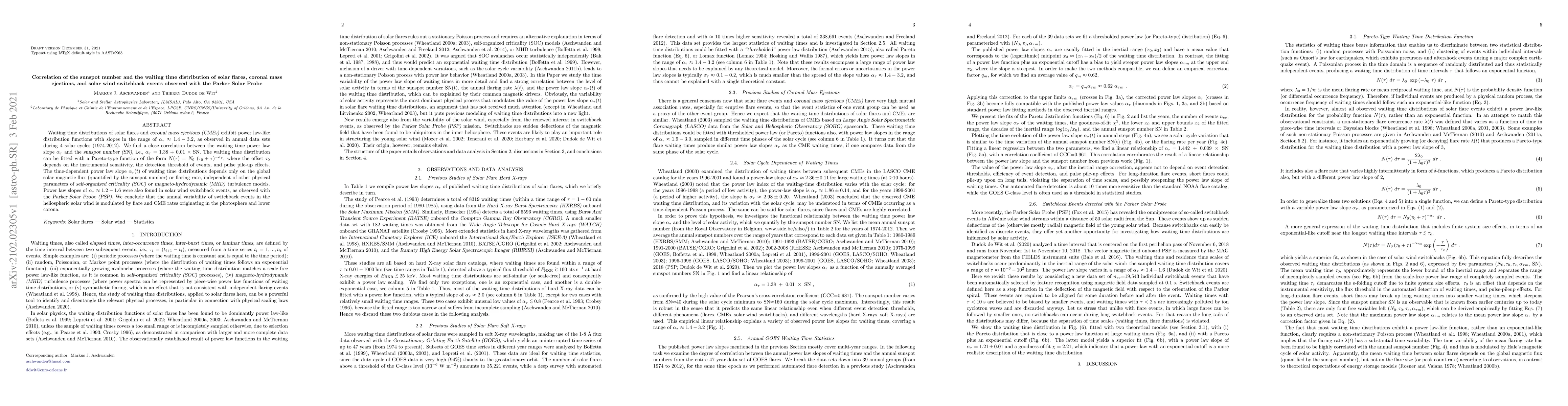 Waiting time distributions of solar flares and {\sl coronal mass ejections (CMEs)} exhibit power law-like distribution functions with slopes in the range of $\alpha_{\tau} \approx 1.4-3.2$, as observed in annual data sets during 4 solar cycles (1974-2012). We find a close correlation between the waiting time power law slope $\alpha_\tau$ and the {\sl sunspot number (SN)}, i.e., $\alpha_\tau$ = 1.38 + 0.01 $\times$ SN. The waiting time distribution can be fitted with a Pareto-type function of the form $N(\tau) = N_0$ $(\tau_0 + \tau)^{-\alpha_{\tau}}$, where the offset $\tau_0$ depends on the instrumental sensitivity, the detection threshold of events, and pulse pile-up effects. The time-dependent power law slope $\alpha_{\tau}(t)$ of waiting time distributions depends only on the global solar magnetic flux (quantified by the sunspot number) or flaring rate, independent of other physical parameters of {\sl self-organized criticality (SOC)} or {\sl magneto-hydrodynamic (MHD)} turbulence models. Power law slopes of $\alpha_{\tau}\approx 1.2-1.6$ were also found in solar wind switchback events, as observed with the {\sl Parker Solar Probe (PSP)}. We conclude that the annual variability of switchback events in the heliospheric solar wind is modulated by flare and CME rates originating in the photosphere and lower corona.