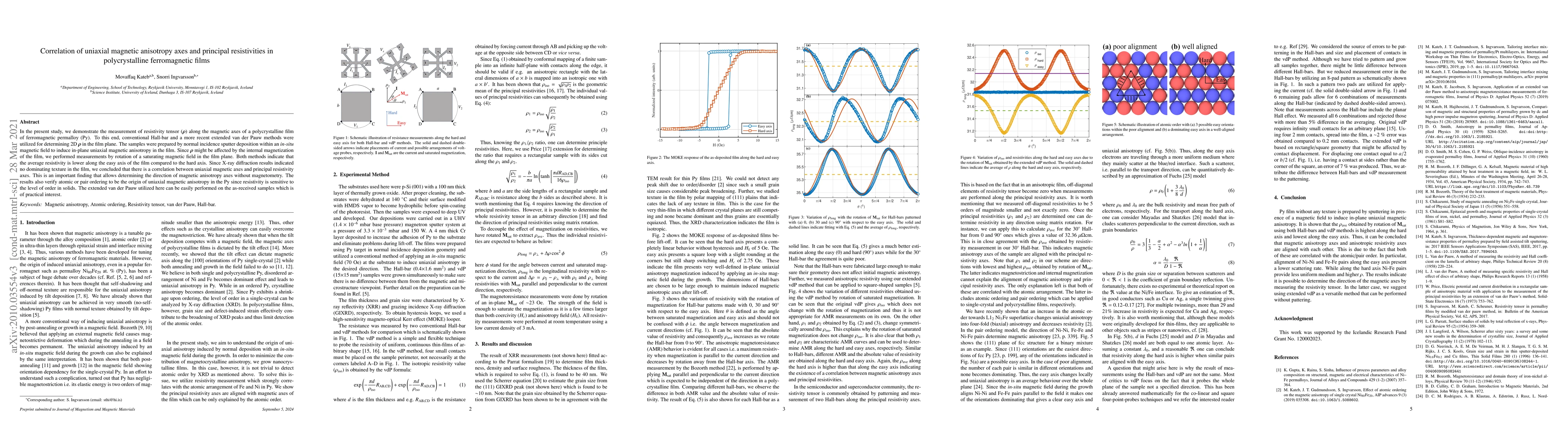 This study investigates the correlation between uniaxial magnetic anisotropy axes and principal resistivities in polycrystalline permalloy films, finding that resistivity is lower along the easy axis. The results suggest that resistivity measurements can determine magnetic anisotropy direction without magnetometry.