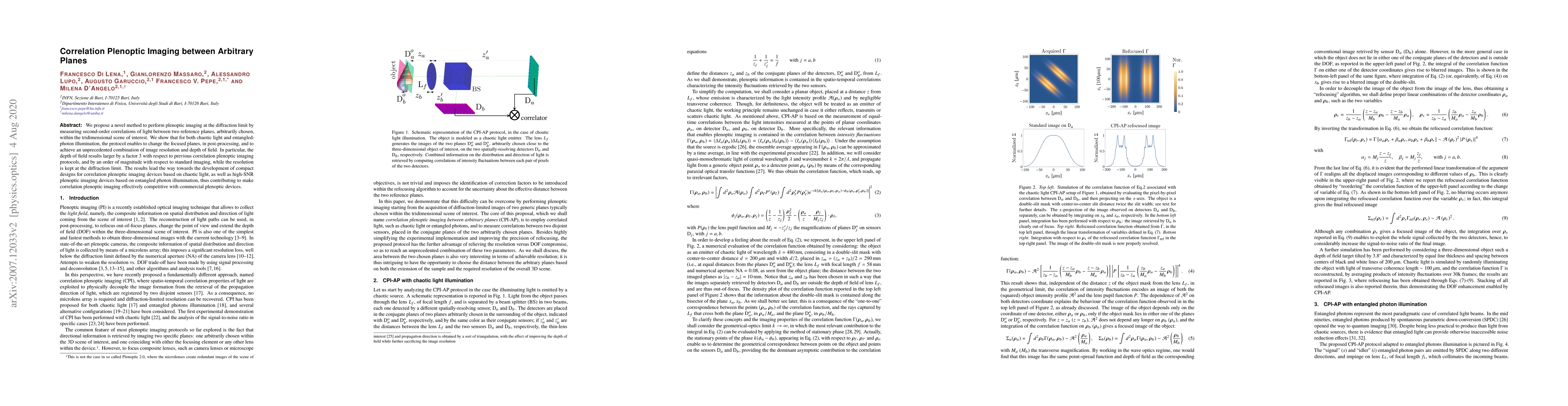 This paper introduces a new method for plenoptic imaging that leverages second-order light correlations between two reference planes to achieve diffraction-limited resolution and significantly enhanced depth of field. The technique outperforms previous methods and standard imaging, paving the way for advanced correlation plenoptic imaging devices.