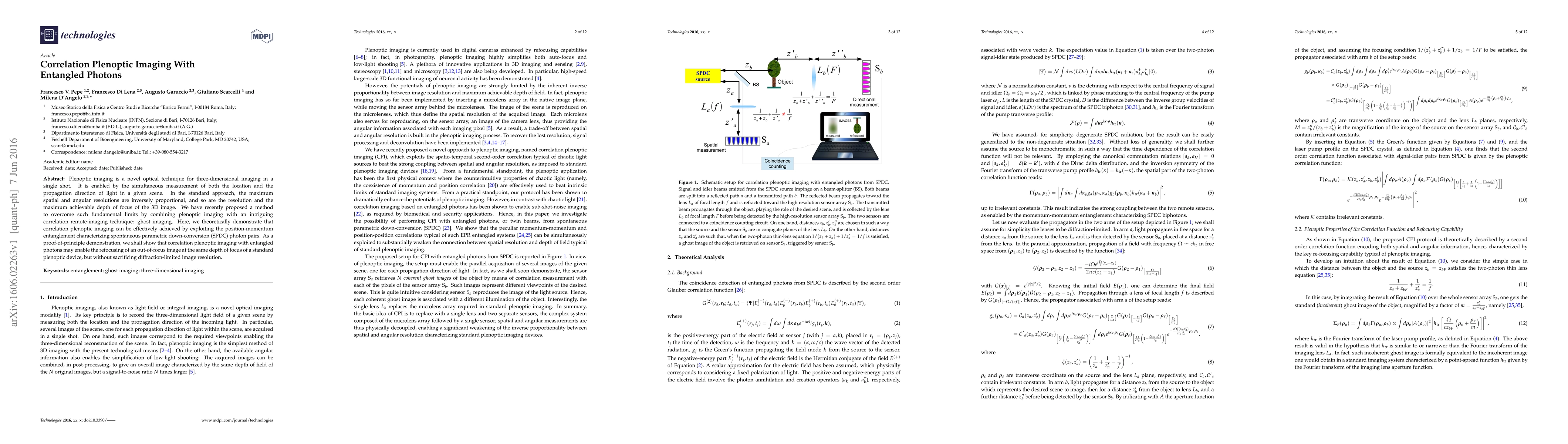 This paper explores a novel method combining plenoptic imaging with ghost imaging using entangled photons to achieve high-resolution 3D imaging without sacrificing depth of focus. The technique leverages the position-momentum entanglement from spontaneous parametric down-conversion to refocus out-of-focus images while maintaining diffraction-limited resolution.