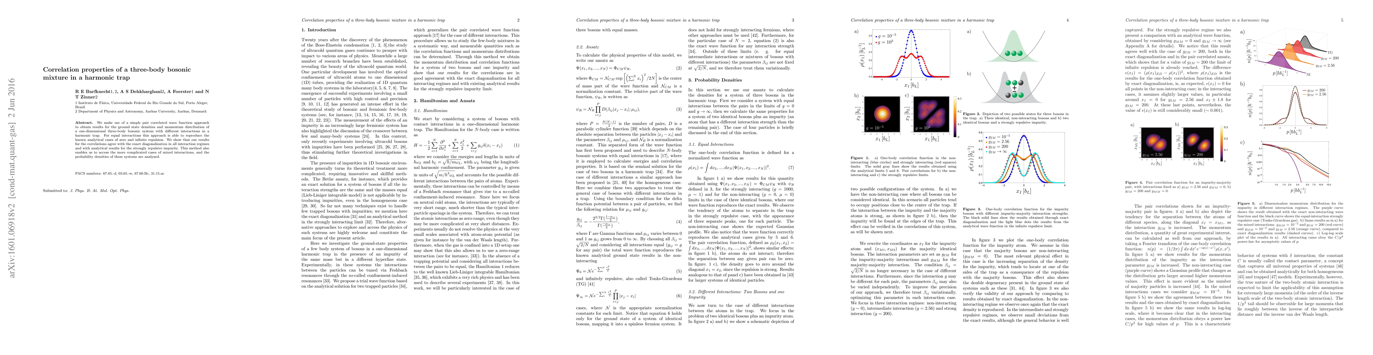 We make use of a simple pair correlated wave function approach to obtain results for the ground-state densities and momentum distribution of a one-dimensional three-body bosonic system with different interactions in a harmonic trap. For equal interactions this approach is able to reproduce the known analytical cases of zero and infinite repulsion. We show that our results for the correlations agree with the exact diagonalization in all interaction regimes and with analytical results for the strongly repulsive impurity. This method also enables us to access the more complicated cases of mixed interactions, and the probability densities of these systems are analyzed.