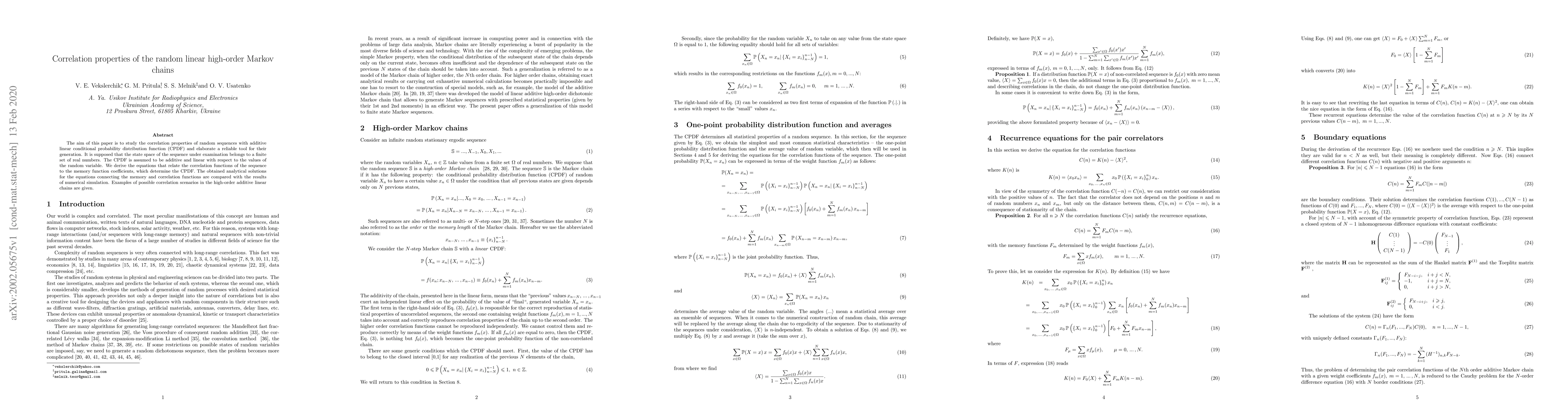 This paper studies correlation properties of random linear high-order Markov chains with additive linear conditional probability distribution functions, deriving analytical solutions for the equations connecting memory and correlation functions.