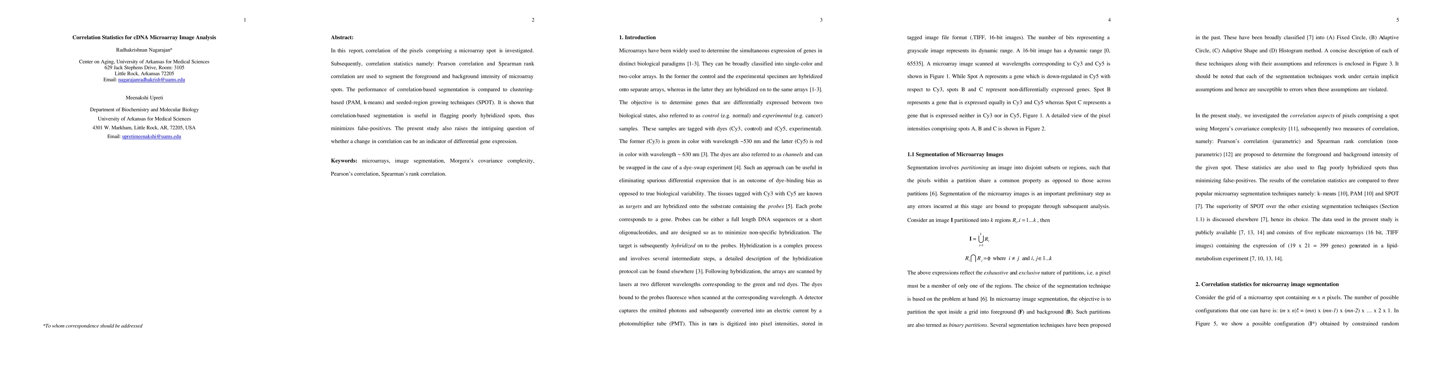 This paper investigates the correlation of pixels in microarray spots to segment foreground and background intensities using Pearson and Spearman correlations, demonstrating its effectiveness in flagging poorly hybridized spots and reducing false-positives compared to clustering and seeded-region growing techniques. It also explores the potential of correlation changes as indicators of differential gene expression.