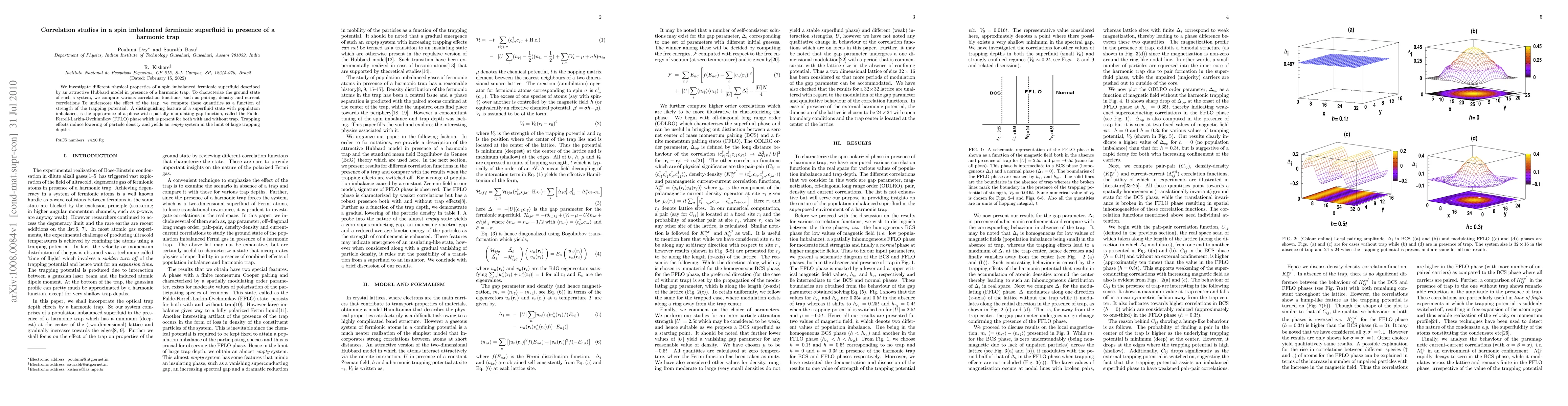 This study examines the ground state properties of a spin imbalanced fermionic superfluid under a harmonic trap, focusing on various correlation functions. The research highlights the emergence of the FFLO phase and the impact of trapping on particle density, ultimately leading to an empty system at high trapping depths.