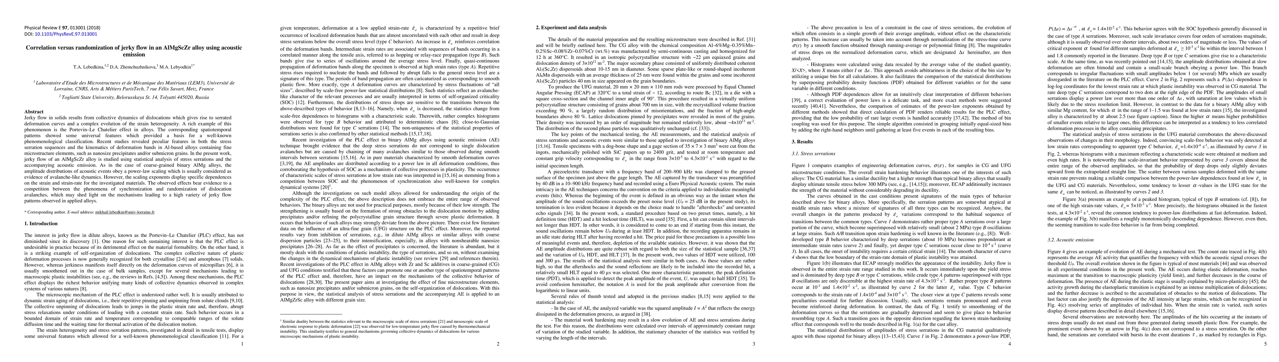 This study investigates jerky flow in an AlMgScZr alloy using acoustic emission to analyze stress serrations, revealing a competition between synchronization and randomization of dislocation avalanches. The power-law scaling in acoustic event amplitude distributions suggests avalanchelike dynamics, with scaling exponents dependent on strain and strain rate.