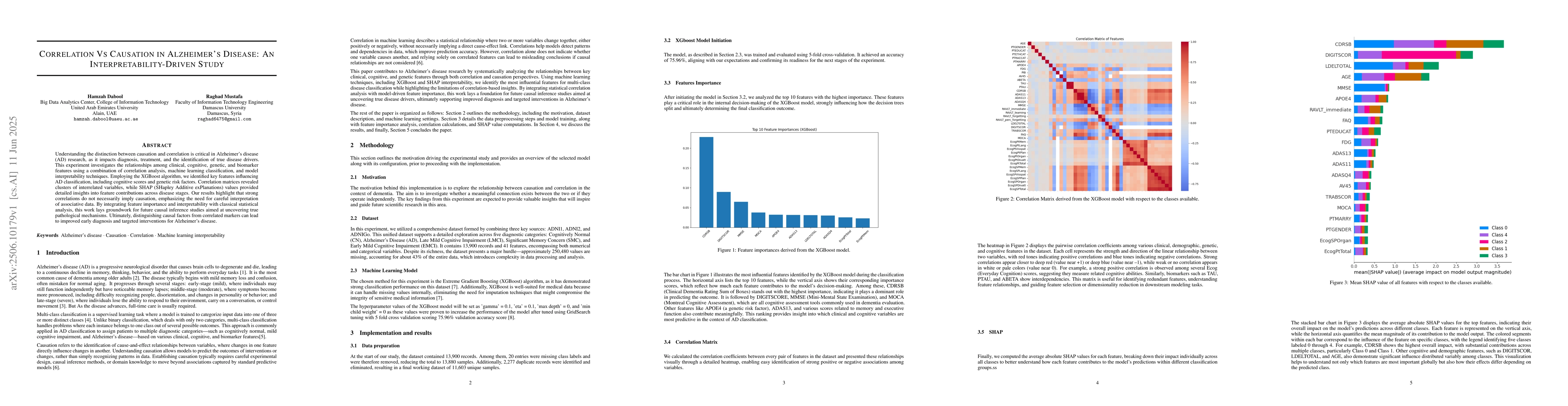 Understanding the distinction between causation and correlation is critical in Alzheimer's disease (AD) research, as it impacts diagnosis, treatment, and the identification of true disease drivers. This experiment investigates the relationships among clinical, cognitive, genetic, and biomarker features using a combination of correlation analysis, machine learning classification, and model interpretability techniques. Employing the XGBoost algorithm, we identified key features influencing AD classification, including cognitive scores and genetic risk factors. Correlation matrices revealed clusters of interrelated variables, while SHAP (SHapley Additive exPlanations) values provided detailed insights into feature contributions across disease stages. Our results highlight that strong correlations do not necessarily imply causation, emphasizing the need for careful interpretation of associative data. By integrating feature importance and interpretability with classical statistical analysis, this work lays groundwork for future causal inference studies aimed at uncovering true pathological mechanisms. Ultimately, distinguishing causal factors from correlated markers can lead to improved early diagnosis and targeted interventions for Alzheimer's disease.