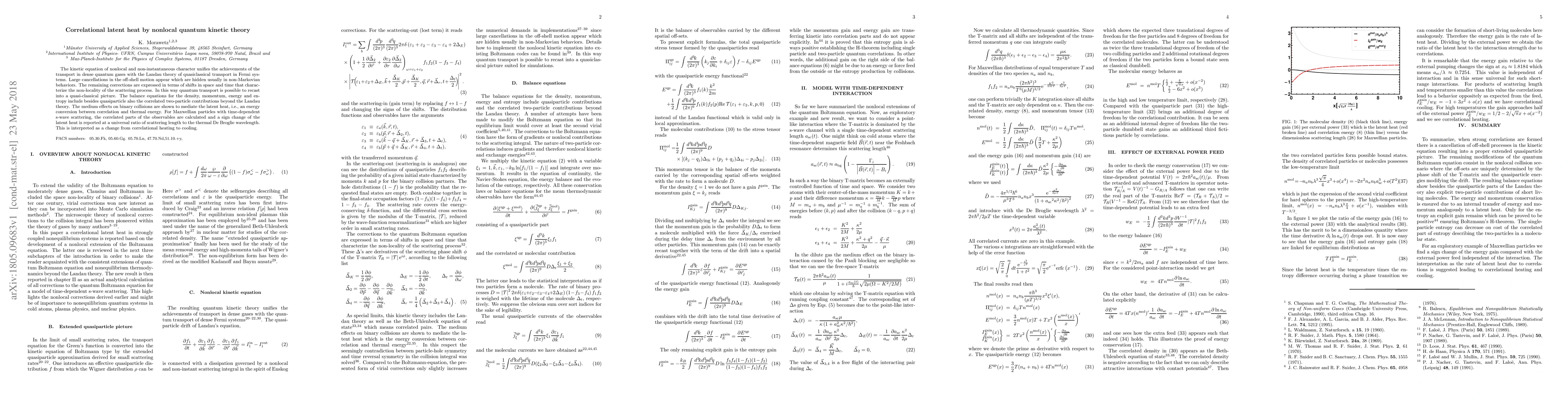 The kinetic equation of nonlocal and non-instantaneous character unifies the achievements of the transport in dense quantum gases with the Landau theory of quasiclassical transport in Fermi systems. Large cancellations in the off-shell motion appear which are hidden usually in non-Markovian behaviors. The remaining corrections are expressed in terms of shifts in space and time that characterize the non-locality of the scattering process. In this way quantum transport is possible to recast into a quasi-classical picture. The balance equations for the density, momentum, energy and entropy include besides quasiparticle also the correlated two-particle contributions beyond the Landau theory. The medium effects on binary collisions are shown to mediate the latent heat, i.e., an energy conversion between correlation and thermal energy. For Maxwellian particles with time-dependent s-wave scattering, the correlated parts of the observables are calculated and a sign change of the latent heat is reported at a universal ratio of scattering length to the thermal De Broglie wavelength. This is interpreted as a change from correlational heating to cooling.