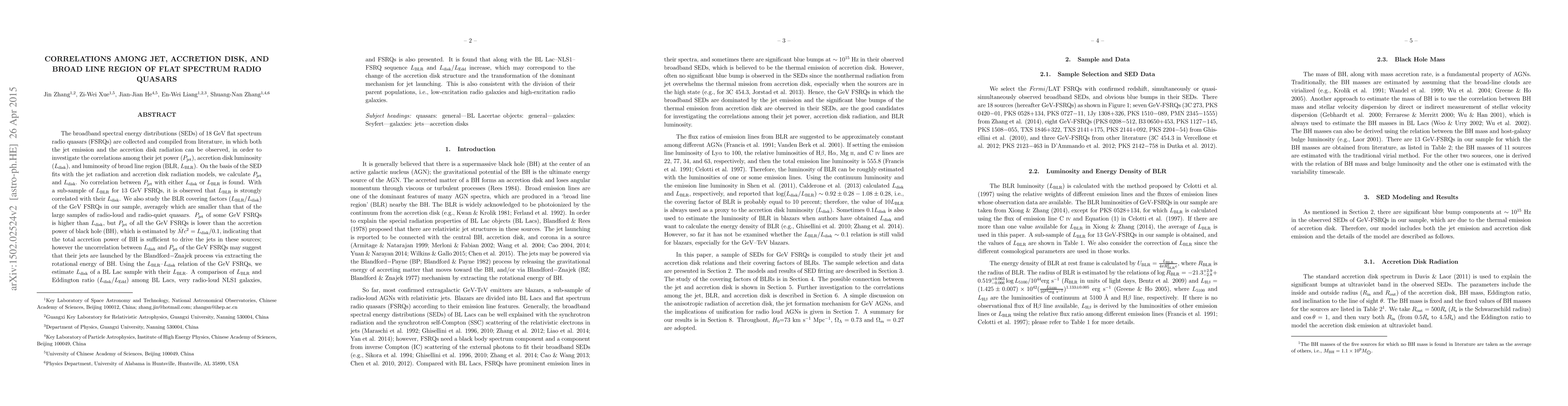 The SEDs of 18 GeV FSRQs are collected and compiled from literature, in which both the jet emission and the accretion disk radiation can be observed, in order to investigate the correlations among their jet power (P_jet), accretion disk luminosity (L_disk), and luminosity of broad line region (BLR, L_BLR). On the basis of the SED fits with the jet radiation and accretion disk radiation models, we calculate P_jet and L_disk. No correlation between P_jet with either L_disk or L_BLR is found. With a sub-sample of L_BLR for 13 GeV FSRQs, it is observed that L_BLR is strongly correlated with their L_disk. We also study the BLR covering factors of the GeV FSRQs in our sample, averagely which are smaller than that of the large samples of radio-loud and radio-quiet quasars. P_jet of some GeV FSRQs is higher than L_disk, but P_jet of all the GeV FSRQs is lower than the accretion power of black hole (BH), which is estimated by \dot{M}c^2=L_disk/0.1, indicating that the total accretion power of BH is sufficient to drive the jets in these sources; however the uncorrelation between L_disk and P_jet of the GeV FSRQs may suggest that their jets are launched by the BZ process via extracting the rotational energy of BH. Using the L_BLR-L_disk relation of the GeV FSRQs, we estimate L_disk of a BL Lac sample with their L_BLR. A comparison of L_BLR and Eddington ratio (L_disk/L_Edd) among BL Lacs, very radio-loud NLS1 galaxies, and FSRQs is also presented. It is found that along with the BL Lac-NLS1-FSRQ sequence L_BLR and L_disk/L_Edd increase, which may correspond to the change of the accretion disk structure and the transformation of the dominant mechanism for jet launching. This is also consistent with the division of their parent populations, i.e., low-excitation radio galaxies and high-excitation radio galaxies.