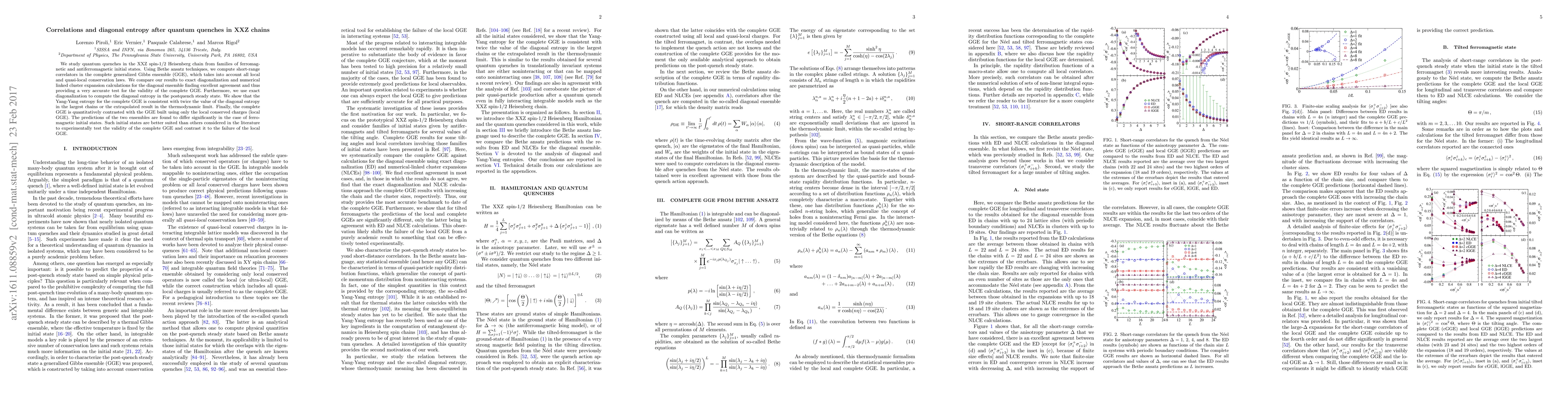 This paper investigates quantum quenches in the XXZ spin-$1/2$ Heisenberg chain, employing Bethe ansatz techniques to compute short-range correlators in the complete generalized Gibbs ensemble (GGE). It finds strong agreement between the GGE and exact diagonalization, confirming the GGE's validity and reveals that the diagonal entropy in the post-quench steady state equals half the Yang-Yang entropy.