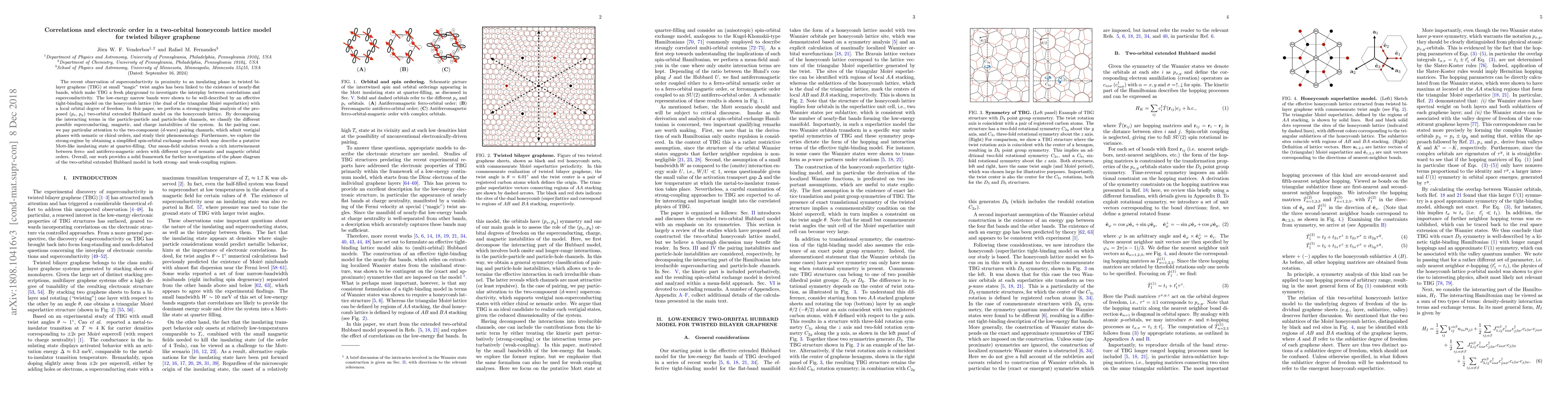 This paper investigates the interplay between correlations and superconductivity in a two-orbital honeycomb lattice model for twisted bilayer graphene, focusing on the potential for superconducting, magnetic, and charge instabilities. The study reveals a complex phase diagram with rich interplay between ferro- and antiferromagnetic orders, nematic, and magnetic orbital orders, providing a framework for future research.