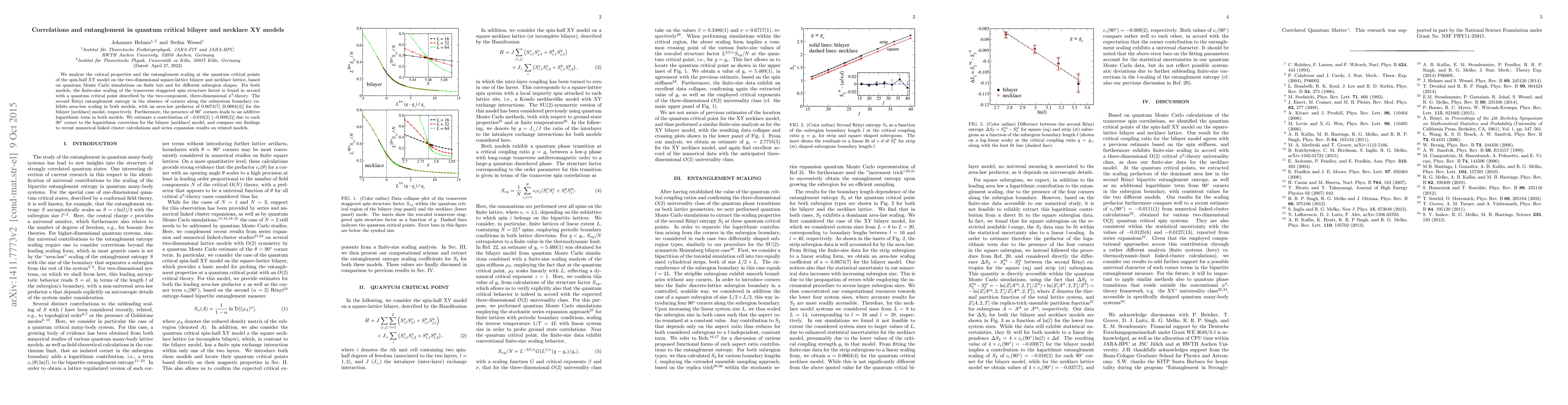 We analyze the critical properties and the entanglement scaling at the quantum critical points of the spin-half XY model on the two-dimensional square-lattice bilayer and necklace lattice, based on quantum Monte Carlo simulations on finite tori and for different subregion shapes. For both models, the finite-size scaling of the transverse staggered spin structure factor is found in accord with a quantum critical point described by the two-component, three-dimensional $\phi^4$-theory. The second R\'enyi entanglement entropy in the absence of corners along the subsystem boundary exhibits area-law scaling in both models, with an area-law prefactor of $0.0674(7)$ [$0.0664(4)$] for the bilayer [necklace] model, respectively. Furthermore, the presence of $90^{\circ}$ corners leads to an additive logarithmic term in both models. We estimate a contribution of $-0.010(2)$ [$-0.009(2)$] due to each $90^{\circ}$ corner to the logarithmic correction for the bilayer [necklace] model, and compare our findings to recent numerical linked cluster calculations and series expansion results on related models.