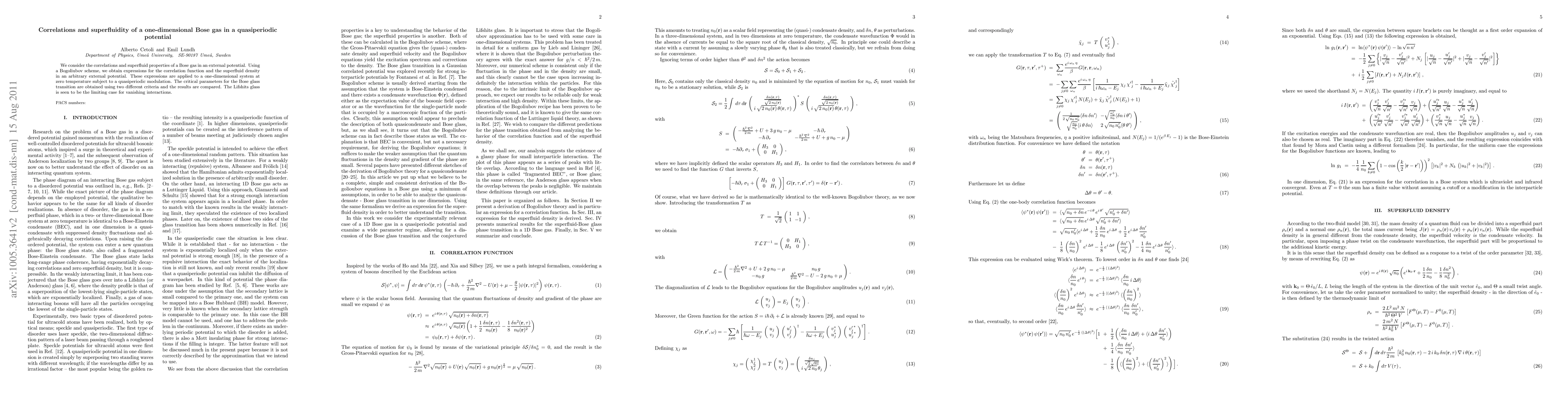 This paper investigates the correlations and superfluid properties of a one-dimensional Bose gas in a quasiperiodic potential, deriving expressions for correlation functions and superfluid density using a Bogoliubov scheme. The study identifies critical parameters for the Bose glass transition and compares results from two different criteria, finding the Lifshits glass as the limit for zero interaction.