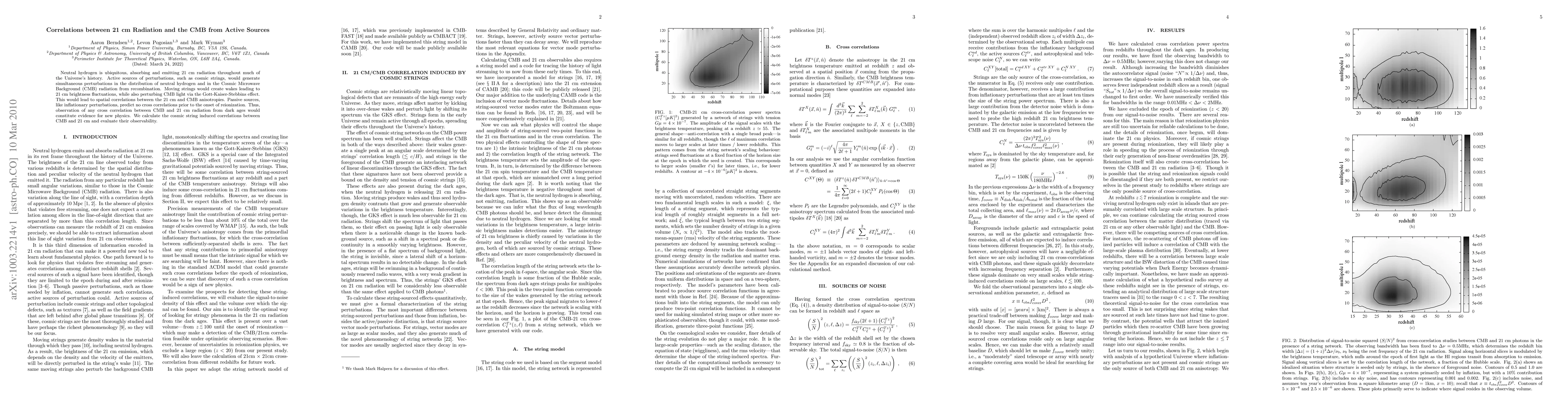 This paper investigates correlations between 21 cm radiation from neutral hydrogen and the Cosmic Microwave Background (CMB) due to active sources like cosmic strings, predicting observable spatial correlations from string-induced perturbations. It evaluates the potential for detecting these correlations as evidence of new physics.
