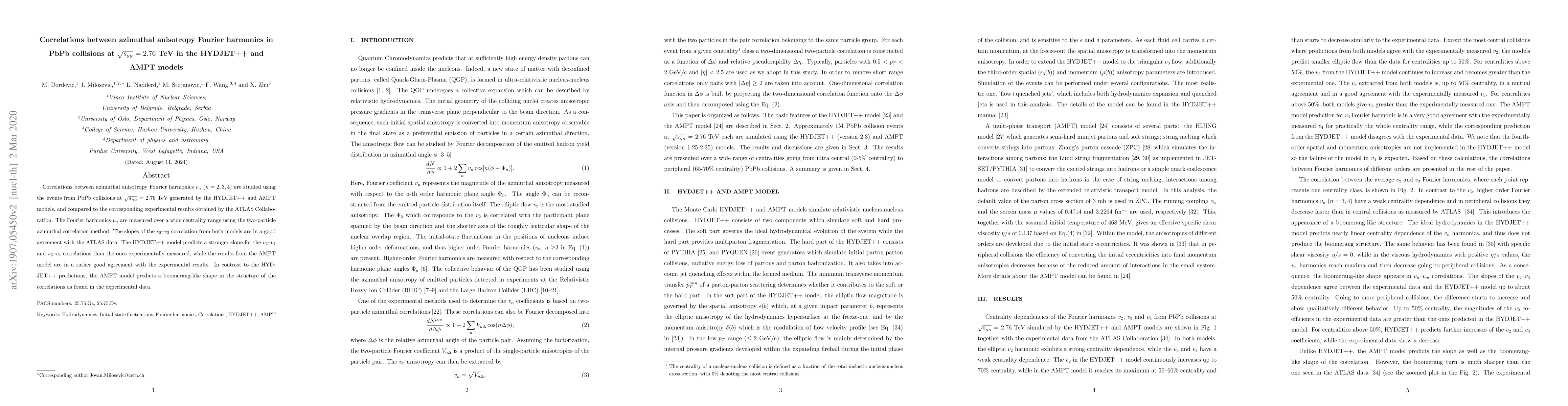 This paper investigates correlations between azimuthal anisotropy Fourier harmonics $v_{n}$ in PbPb collisions at $\sqrt{s_{_{\mathrm{NN}}}}=2.76$ TeV using HYDJET++ and AMPT models, finding good agreement between the $v_{2}$--$v_{3}$ correlation slopes and ATLAS data, but discrepancies in $v_{2}$--$v_{4}$ and $v_{3}$--$v_{4}$ correlations for HYDJET++.