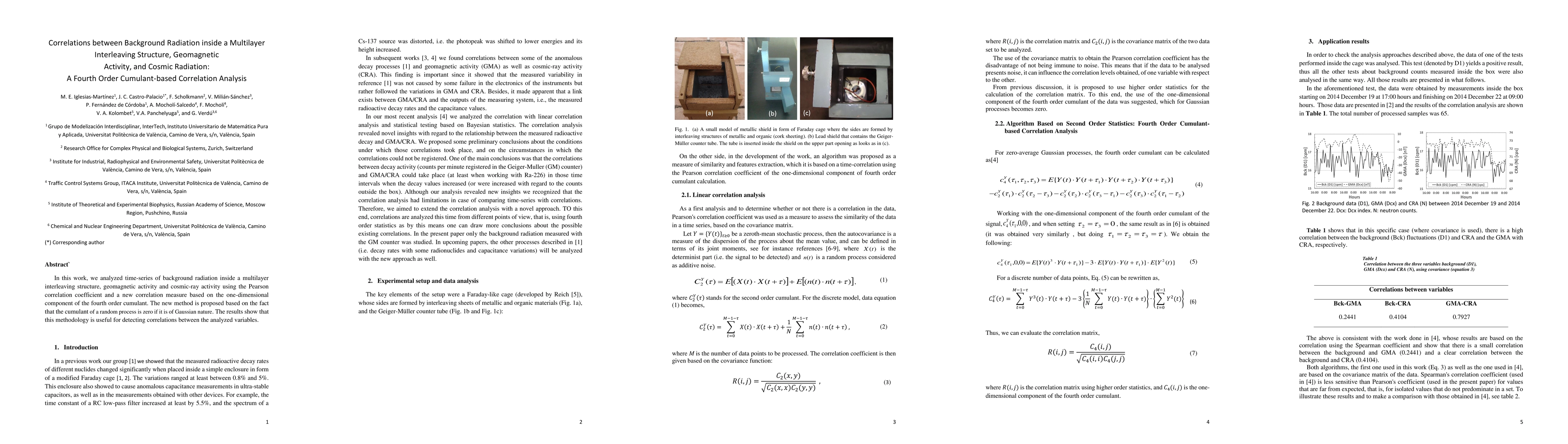 In this work, we analyzed time-series of background radiation inside a multilayer interleaving structure, geomagnetic activity and cosmic-ray activity using the Pearson correlation coefficient and a new correlation measure based on the one-dimensional component of the fourth order cumulant. The new method is proposed based on the fact that the cumulant of a random process is zero if it is of Gaussian nature. The results show that this methodology is useful for detecting correlations between the analyzed variables.
