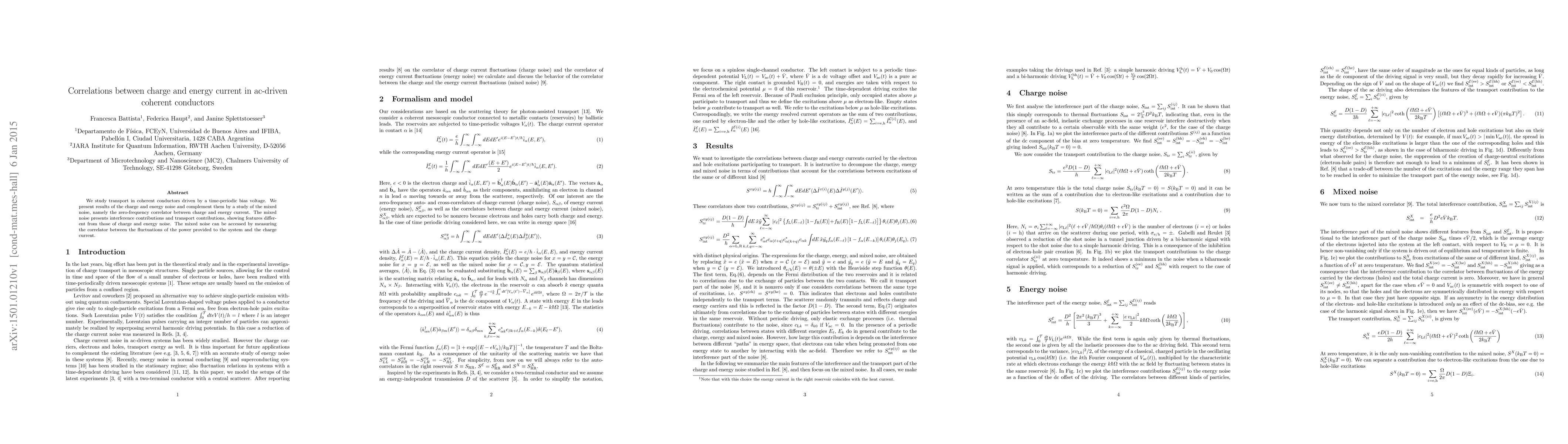 This paper investigates the interplay between charge and energy currents in ac-driven coherent conductors, revealing distinct interference and transport contributions in the zero-frequency correlator between charge and energy currents, which can be measured via fluctuations in the power supplied to the system.
