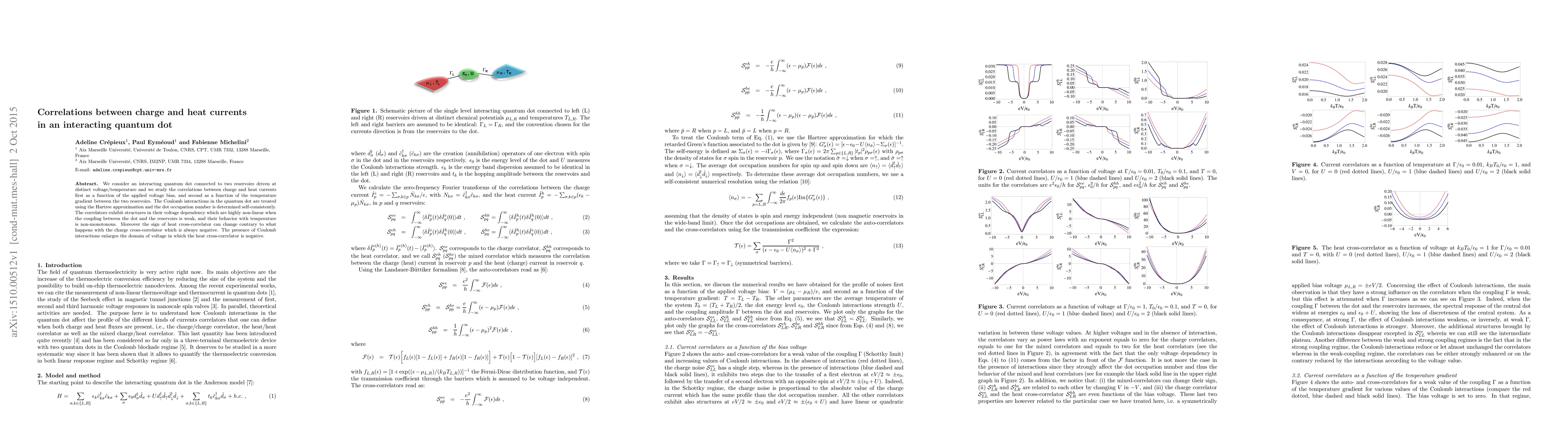 This paper investigates the interplay between charge and heat currents in an interacting quantum dot under varying voltage biases and temperature gradients. It finds non-linear voltage dependencies and non-monotonic temperature behaviors in current correlations, with the heat cross-correlator's sign potentially reversing unlike the always negative charge cross-correlator.