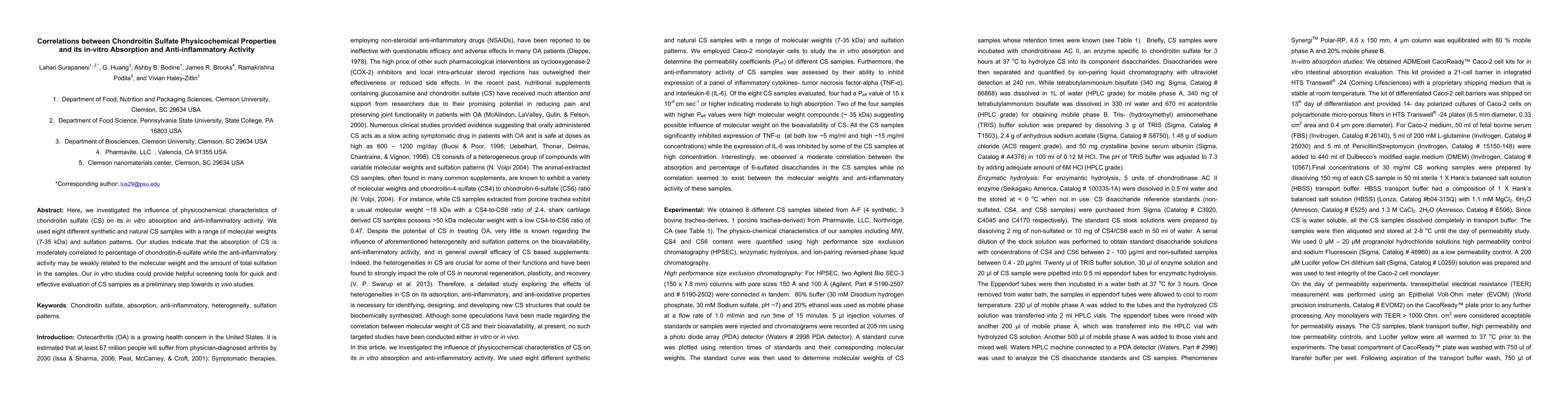 Here, we investigated the influence of physicochemical characteristics of chondroitin sulfate (CS) on its in vitro absorption and anti-inflammatory activity. We used eight different synthetic and natural CS samples with a range of molecular weights (7-35 kDa) and sulfation patterns. Our studies indicate that the absorption of CS is moderately correlated to percentage of chondroitin-6-sulfate while the anti-inflammatory activity may be weakly related to the molecular weight and the amount of total sulfation in the samples. Our in vitro studies could provide helpful screening tools for quick and effective evaluation of CS samples as a preliminary step towards in vivo studies.