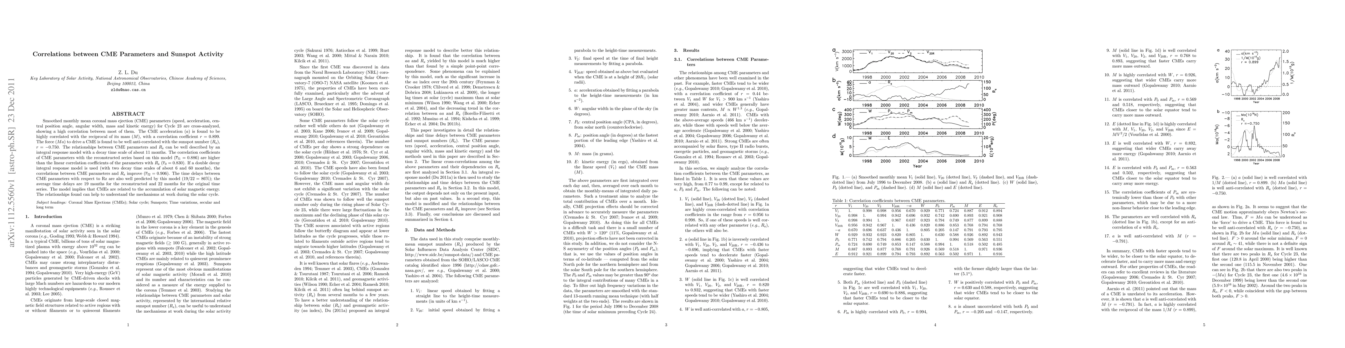 This study investigates correlations between coronal mass ejection (CME) parameters and sunspot activity during Cycle 23, finding high inter-correlations among CME parameters and a strong anti-correlation between CME acceleration and sunspot numbers. A double decay integral response model enhances the correlation between CME parameters and sunspot activity, suggesting CMEs are linked to solar magnetic energy accumulation.