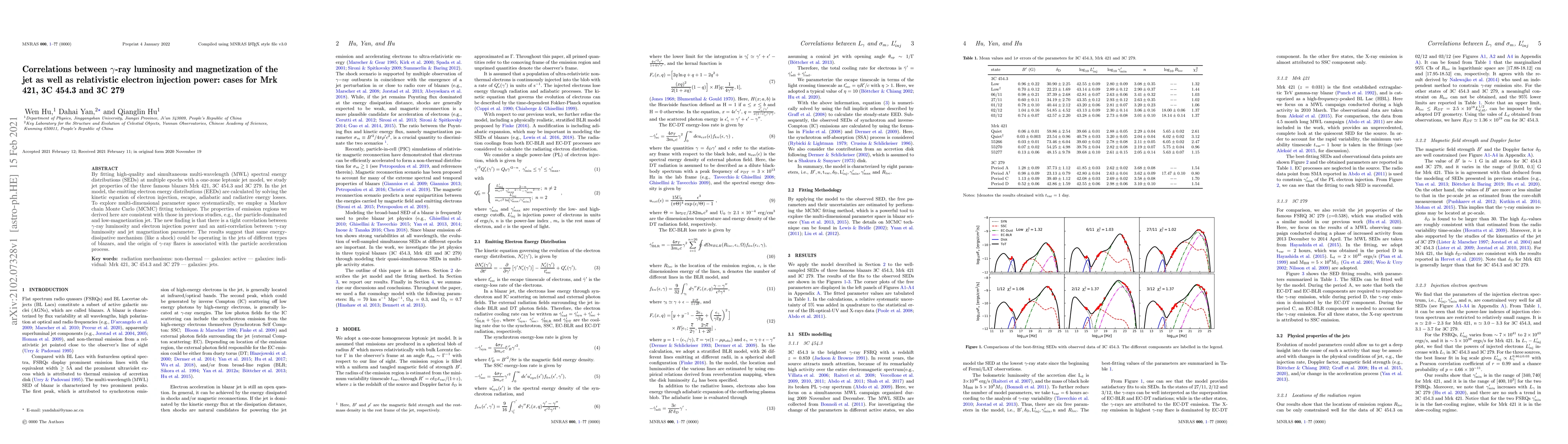 By fitting high-quality and simultaneous multi-wavelength (MWL) spectral energy distributions (SEDs) at multiple epochs with a one-zone leptonic jet model, we study jet properties of the three famous blazars Mrk 421, 3C 454.3 and 3C 279. In the jet model, the emitting electron energy distributions (EEDs) are calculated by solving the kinetic equation of electron injection, escape, adiabatic and radiative energy losses. To explore multi-dimensional parameter space systematically, we employ a Markov chain Monte Carlo (MCMC) fitting technique. The properties of emission regions we derived here are consistent with those in previous studies, e.g., the particle-dominated and low-magnetization jet. The new finding is that there is a tight correlation between $\gamma$-ray luminosity and electron injection power and an anti-correlation between $\gamma$-ray luminosity and jet magnetization parameter. The results suggest that same energy-dissipative mechanism (like a shock) could be operating in the jets of different types of blazars, and the origin of $\gamma$-ray flares is associated with the particle acceleration process.