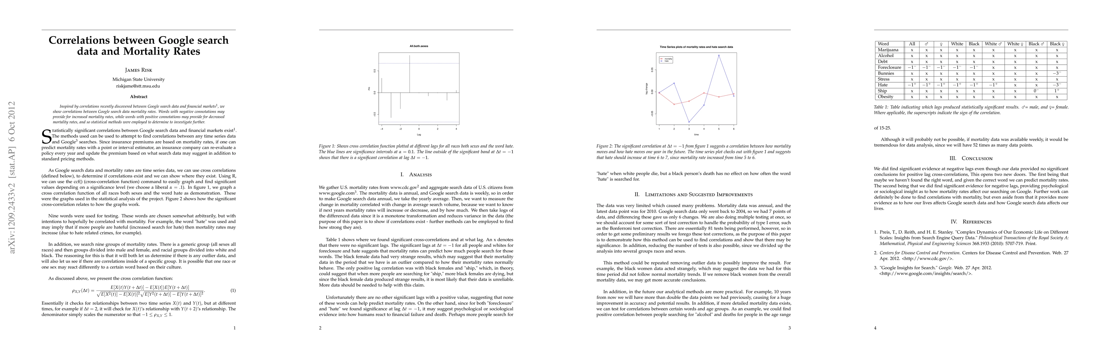Summary: This study explores correlations between Google search trends and mortality rates, finding that search terms with negative connotations correlate with higher mortality rates, while positive terms correlate with lower rates, suggesting a potential link between public sentiment and health outcomes. Statistical methods were used to investigate these associations further.