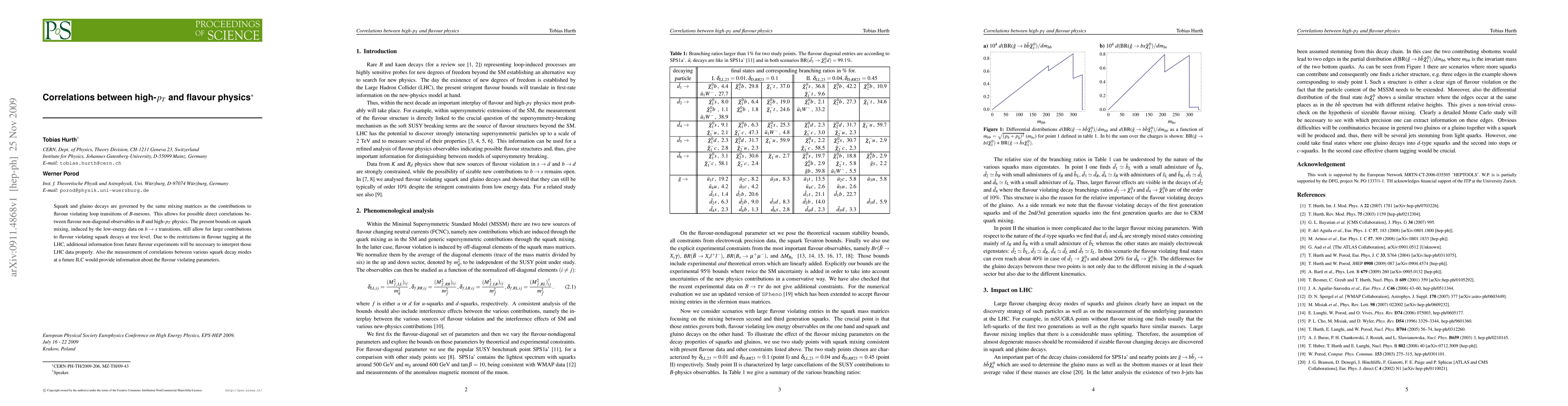 This paper explores potential correlations between high-p_T physics and flavour non-diagonal observables in B-mesons, driven by squark and gluino decays. Future LHC and ILC experiments are crucial for interpreting these correlations and measuring flavour-violating squark decay modes.