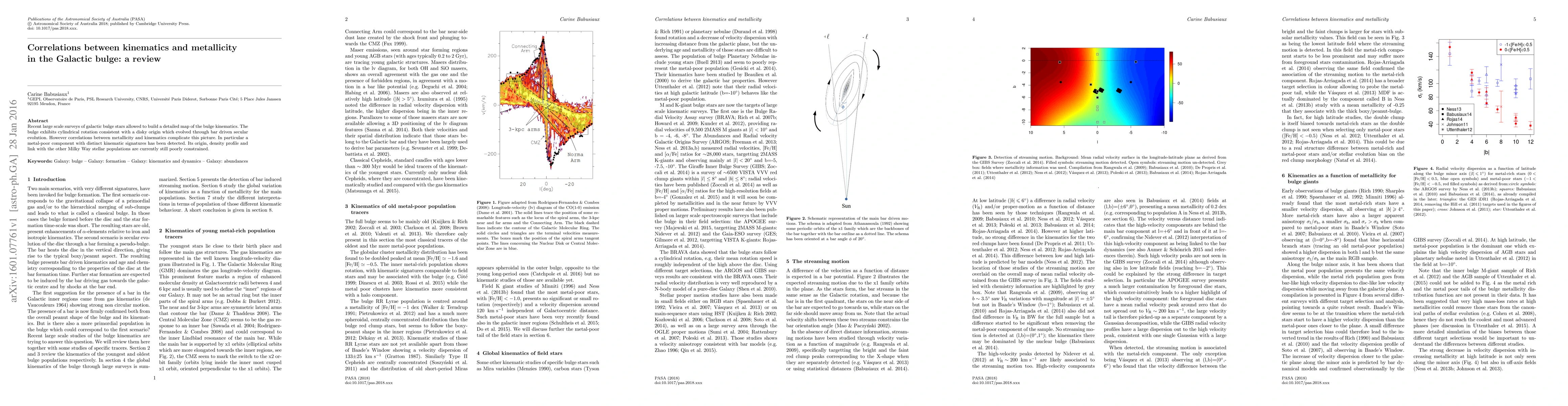 Summary: Recent surveys reveal the Galactic bulge's cylindrical rotation indicative of disky origins, but correlations between metallicity and kinematics show a metal-poor component with unique signatures, complicating the evolutionary picture and leaving its origin and connections to other stellar populations unclear.