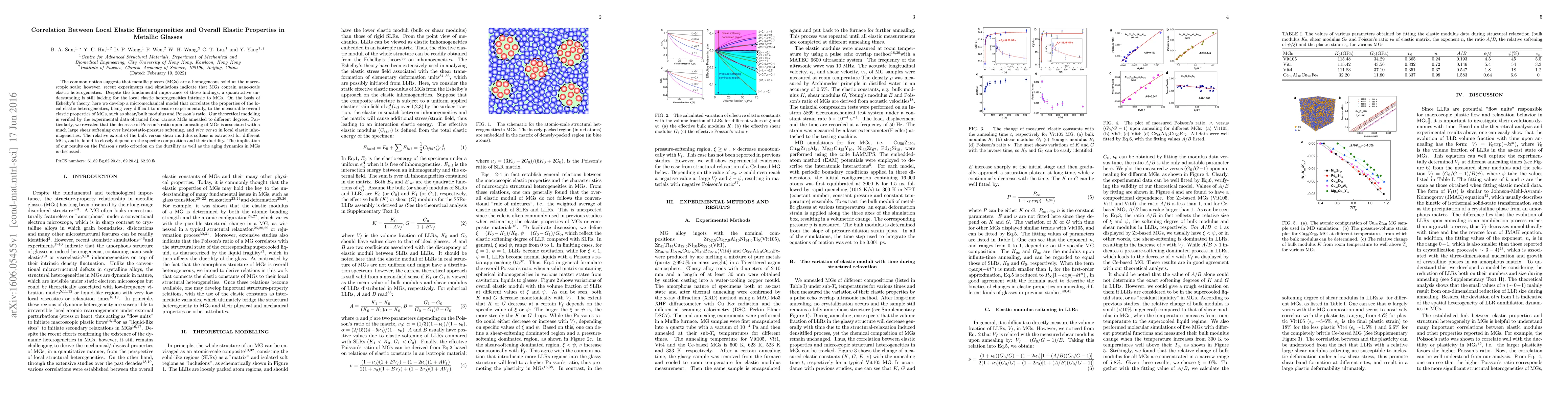This paper develops a micromechanical model correlating nano-scale elastic heterogeneities in metallic glasses to their overall elastic properties, verified by experimental data. The study reveals that changes in Poisson's ratio during annealing are linked to differing shear and hydrostatic-pressure softening in local heterogeneities, with implications for ductility and aging dynamics.