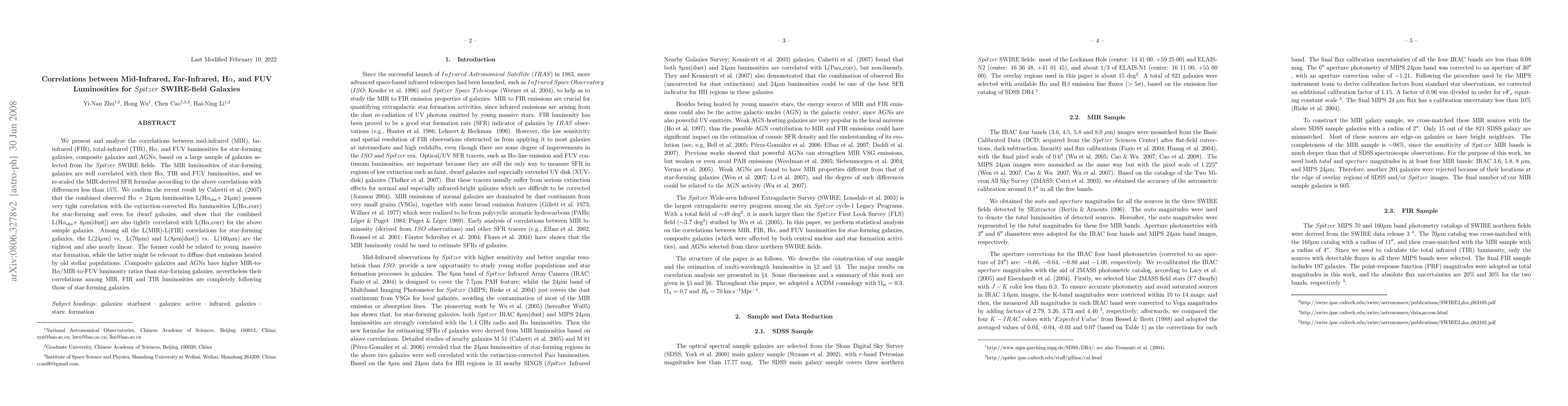 This paper investigates correlations between mid-infrared (MIR), far-infrared (FIR), H$\alpha$, and FUV luminosities for star-forming galaxies, composite galaxies, and AGNs from the SWIRE fields. It finds strong correlations between MIR and H$\alpha$, TIR, and FUV luminosities for star-forming galaxies, and confirms tight relationships between observed and extinction-corrected H$\alpha$ luminosities.