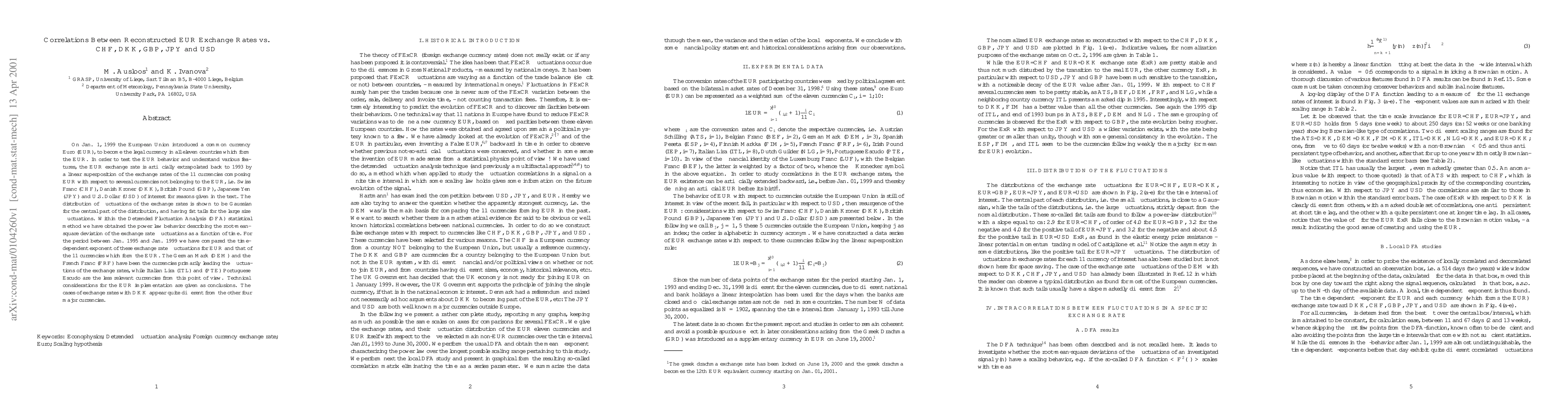 On Jan. 1, 1999 the European Union introduced a common currency Euro ($EUR$), to become the legal currency in all eleven countries which form the $EUR$. In order to test the $EUR$ behavior and understand various features, the $EUR$ exchange rate is artificially extrapolated back to 1993 by a linear superposition of the exchange rates of the 11 currencies composing $EUR$ with respect to several currencies not belonging to the $EUR$, i.e. Swiss Franc ($CHF$), Danish Kroner ($DKK$), British Pound ($GBP$), Japanese Yen ($JPY$) and U.S. Dollar ($USD$) of interest for reasons given in the text. The distribution of fluctuations of the exchange rates is shown to be Gaussian for the central part of the distribution, and having fat tails for the large size fluctuations. Within the {\it Detrended Fluctuation Analysis} ($DFA$) statistical method we have obtained the power law behavior describing the root-mean-square deviation of the exchange rate fluctuations as a function of time. For the period between Jan. 1995 and Jan. 1999 we have compared the time-dependent exponent of these exchange rate fluctuations for $EUR$ and that of the 11 currencies which form the $EUR$. The German Mark ($DEM$) and the French Franc ($FRF$) have been the currencies primarily leading the fluctuations of the exchange rates, while Italian Lira ($ITL$) and ($PTE$) Portuguese Escudo are the less relevant currencies from this point of view. Technical considerations for the $EUR$ implementation are given as conclusions. The cases of exchange rates with $DKK$ appear quite different from the other four major currencies.