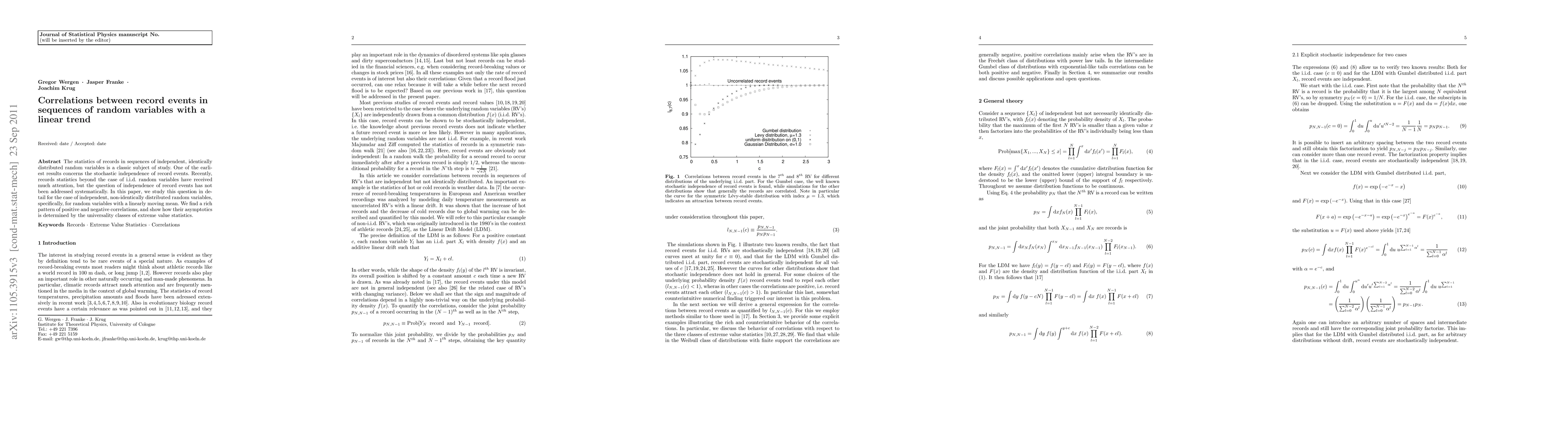 This paper investigates correlations between record events in sequences of random variables with a linear trend, finding positive and negative correlations that depend on the universality classes of extreme value statistics.