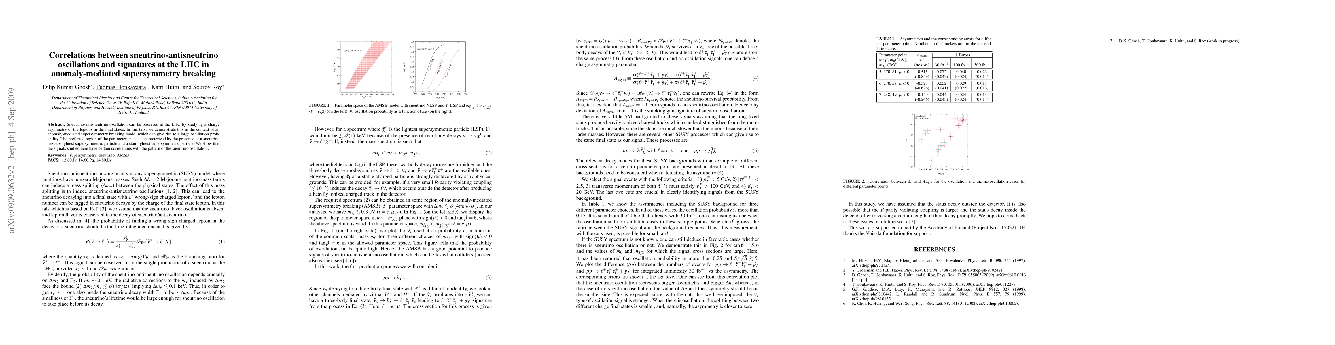 Sneutrino-antisneutrino oscillation can be observed at the LHC by studying a charge asymmetry of the leptons in the final states. In this talk, we demonstrate this in the context of an anomaly-mediated supersymmetry breaking model which can give rise to a large oscillation probability. The preferred region of the parameter space is characterized by the presence of a sneutrino next-to-lightest supersymmetric particle and a stau lightest supersymmetric particle. We show that the signals studied here have certain correlations with the pattern of the sneutrino oscillation.