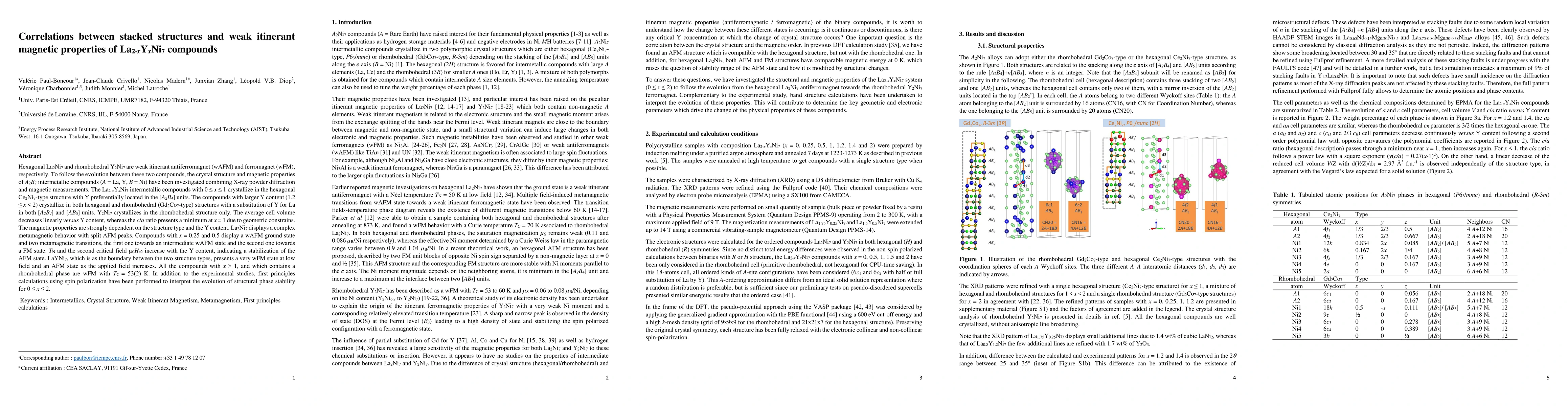 This study investigates the crystal structures and magnetic properties of La$_{2-x}$Y$_x$Ni$_7$ intermetallic compounds, revealing a correlation between their structural phases and weak itinerant magnetic properties. The compounds exhibit complex magnetic behaviors influenced by Y content and structural transitions, with first principles calculations supporting the observed trends.