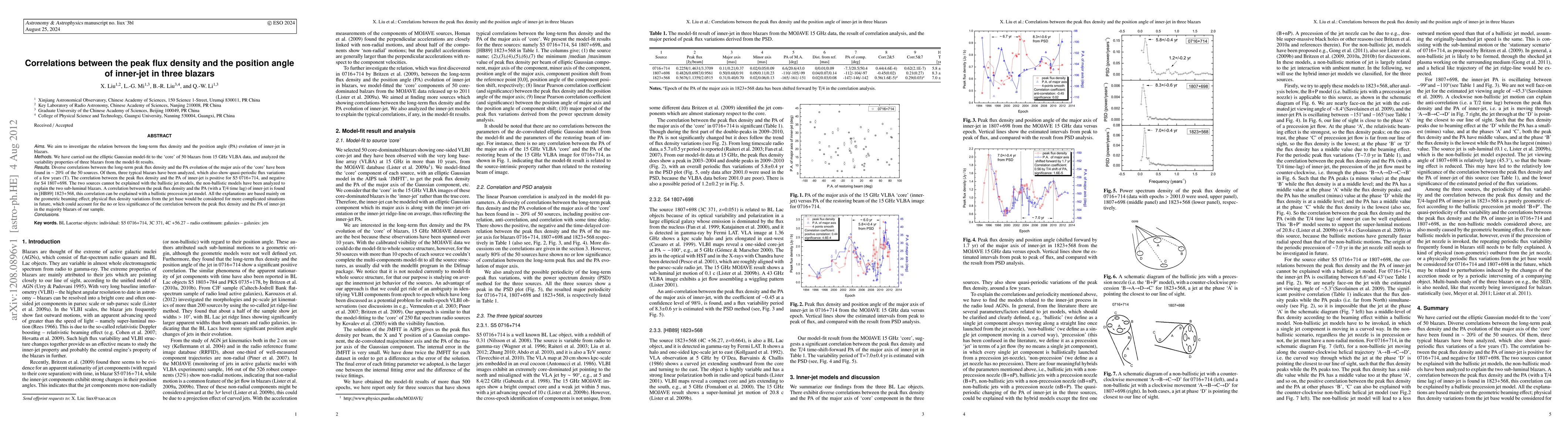 This paper investigates the relationship between the long-term flux density and position angle evolution of the inner-jet in blazars, finding diverse correlations in about 20% of 50 blazars. Three blazars show quasi-periodic flux variations, with positive and negative correlations in different sources, suggesting non-ballistic models for some and a precession jet model for another.