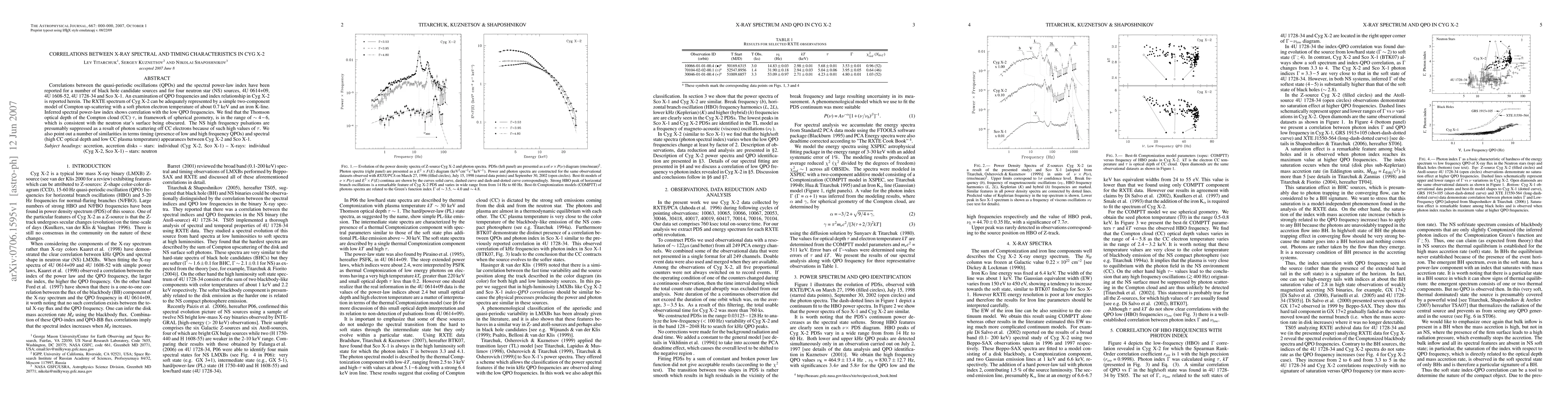 Correlations between the quasi-periodic oscillations (QPOs) and the spectral power-law index have been reported for a number of black hole candidate sources and for four neutron star (NS) sources, 4U 0614+09, 4U 1608-52, 4U 1728-34 and Sco X-1. An examination of QPO frequencies and index relationship in Cyg X-2 is reported herein. The RXTE spectrum of Cyg X-2 can be adequately represented by a simple two-component model of Compton up-scattering with a soft photon electron temperature of about 0.7 keV and an iron K-line. Inferred spectral power-law index shows correlation with the low QPO frequencies. We find that the Thomson optical depth of the Compton cloud (CC) tau, in framework of spherical geometry, is in the range of ~4-6, which is consistent with the neutron star's surface being obscured. The NS high frequency pulsations are presumably suppressed as a result of photon scattering off CC electrons because of such high values of tau. We also point out a number of similarities in terms timing (presence of low and high frequency QPOs) and spectral (high CC optical depth and low CC plasma temperature) appearances between Cyg X-2 and Sco X-1.