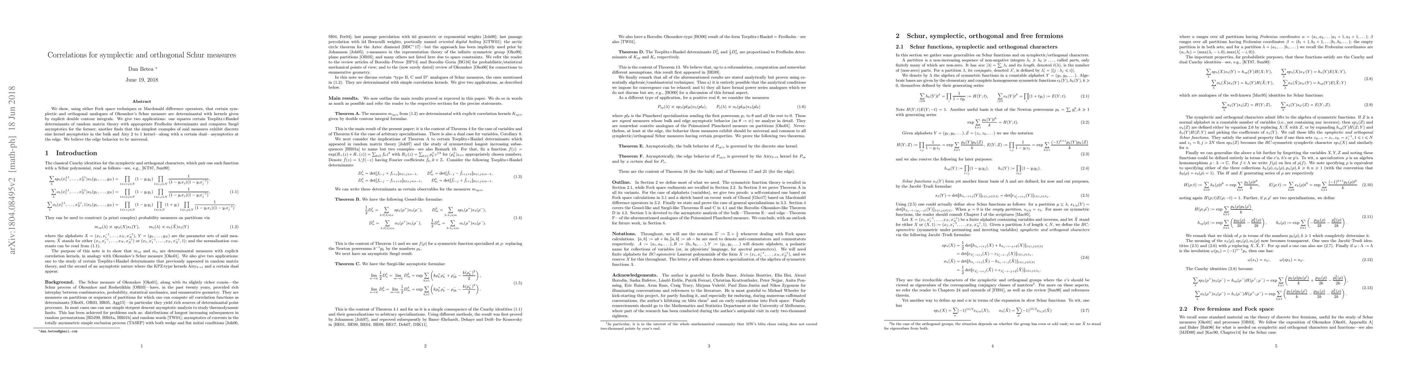 This research demonstrates that specific symplectic and orthogonal Schur measure analogues are determinantal, with kernels expressed as double contour integrals. It applies these findings to equate certain random matrix theory determinants and compute Szegö asymptotics, while also identifying discrete sine kernel asymptotics in the bulk and Airy 2 to 1 kernel behavior at the edge, suggesting potential universality.