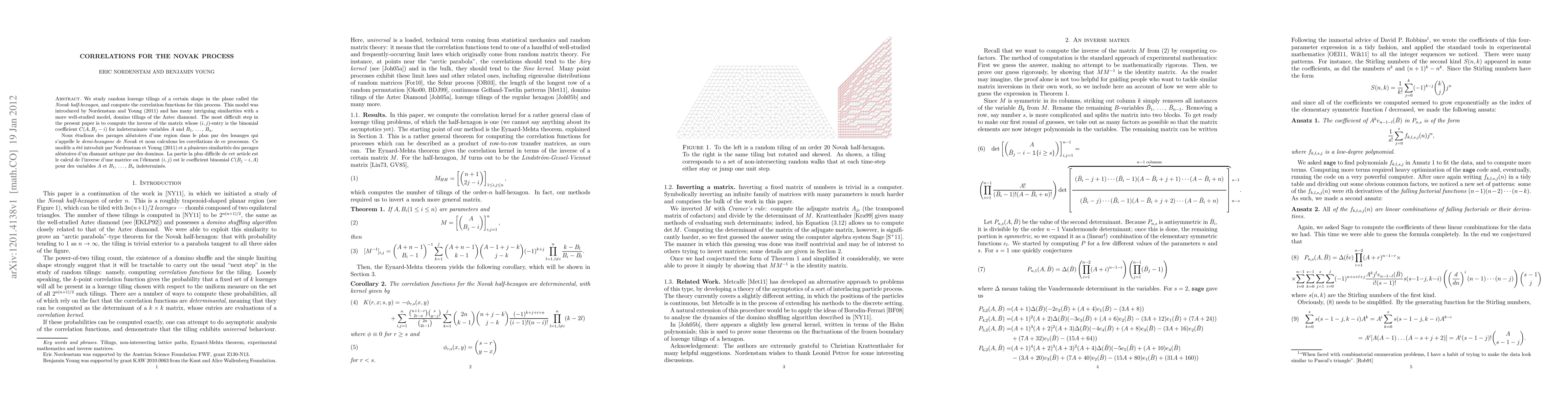 We study random lozenge tilings of a certain shape in the plane called the Novak half-hexagon, and compute the correlation functions for this process. This model was introduced by Nordenstam and Young (2011) and has many intriguing similarities with a more well-studied model, domino tilings of the Aztec diamond. The most difficult step in the present paper is to compute the inverse of the matrix whose (i,j) entry is the binomial coefficient C(A, B_j - i) for indeterminate variables A and B_1, ..., B_n.