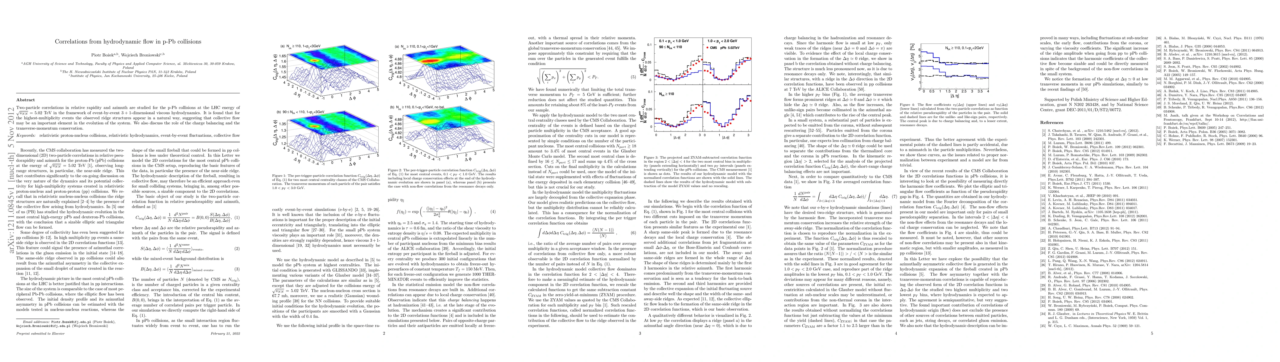Two-particle correlations in relative rapidity and azimuth are studied for the p-Pb collisions at the LHC energy of 5.02 TeV in the framework of event-by-event 3+1-dimensional viscous hydrodynamics. It is found that for the highest-multiplicity events the observed ridge structures appear in a natural way, suggesting that collective flow may be an important element in the evolution of the system. We also discuss the role of the charge balancing and the transverse-momentum conservation.
